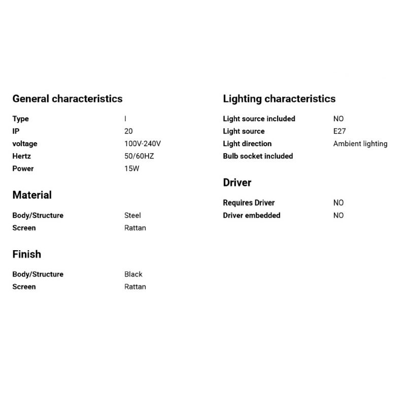 Descriere | structura din otel finisaj negru, abajur din fibre de ratan impletite |