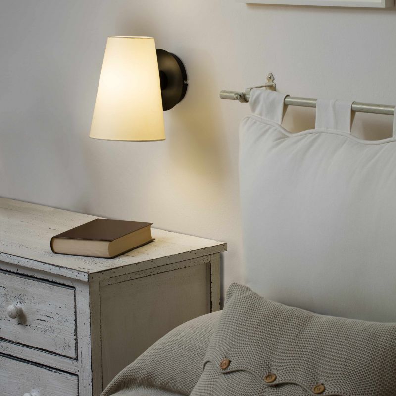 Descriere | baza metal negru, abajur textil conic finisaj bej, intrerupator on/off aplicat pe baza |