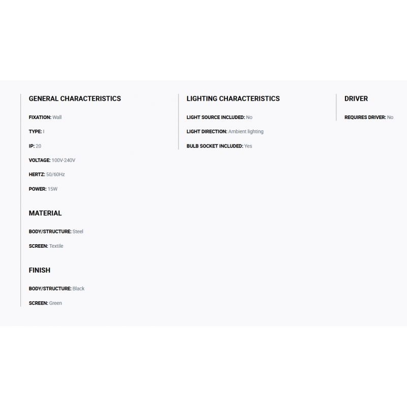 Materiale | baza metal finisaj negru, abajur textil plisat verde |