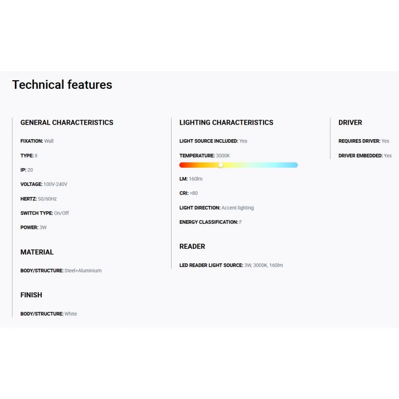 Informatii produs: | lampa de perete cu reader LED cu design modern minimalist, are un comutator mic pe baza, perfecta pentru dormitoare moderne. |