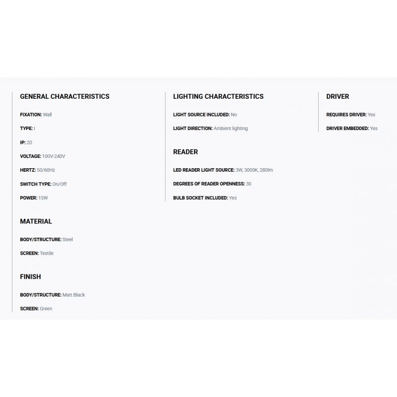 Materiale | baza metal finisaj negru, abajur textil plisat verde |