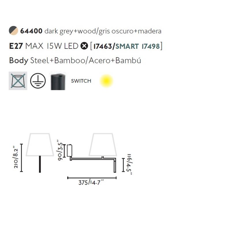 Descriere | baza otel gri inchis cu maner lemn bambus, abajur textil finisaj bej, intrerupator on/off aplicat pe baza |