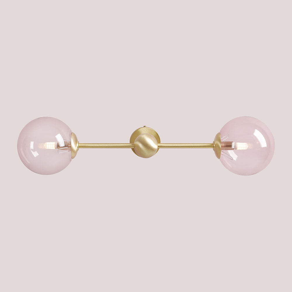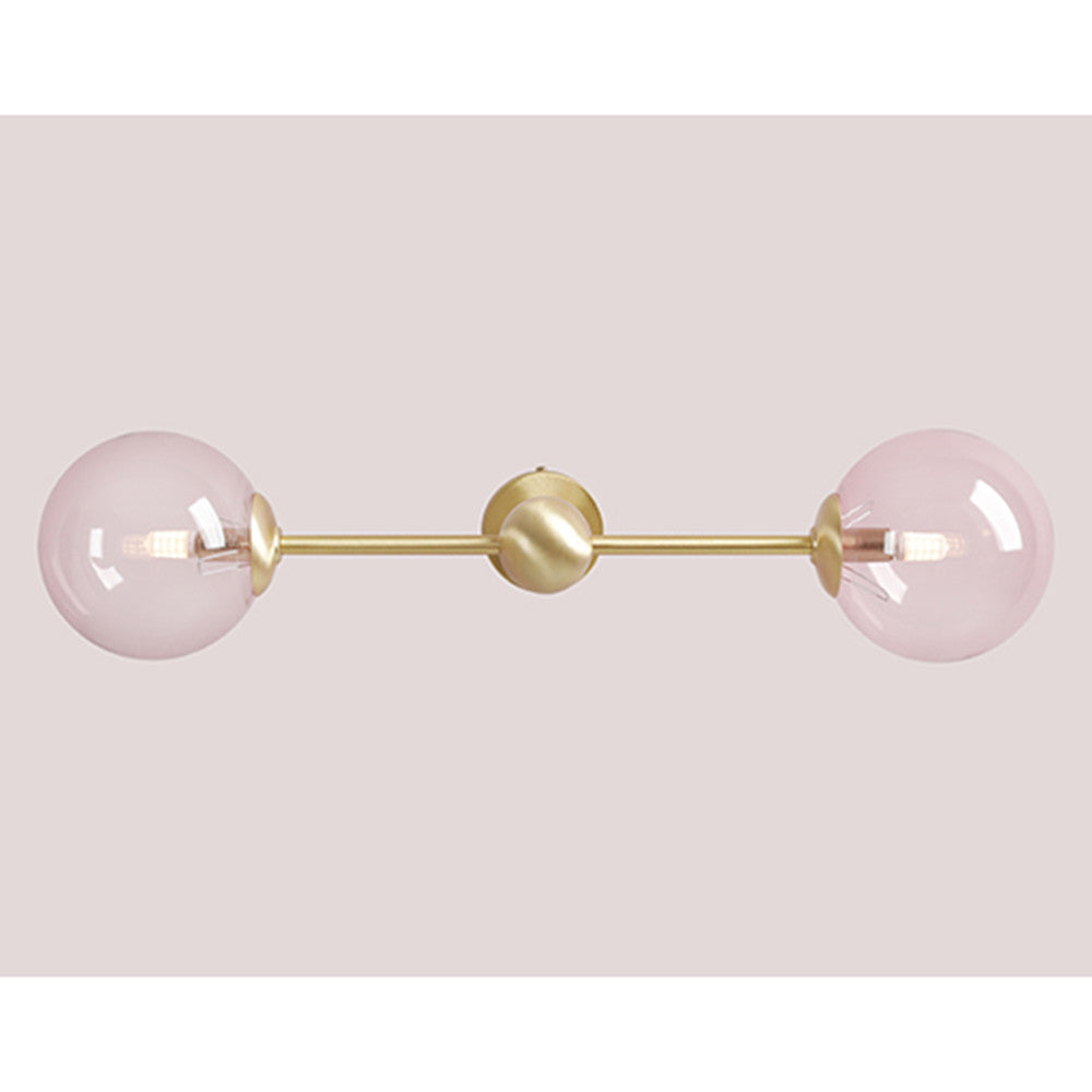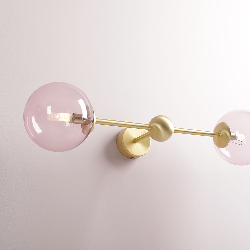 Aplica poate fi montata atat pe perete (vertical sau orizontal), cat si pe tavan. Este fabricata din alama, care a fost supusa unui proces de periere si lacuire. Abajururile sferice, de culoare roz, imprastie lumina usor si uniform. Aplica va fi o piesa de iluminat fermecatoare pentru dormitor, hol sau camera de zi.