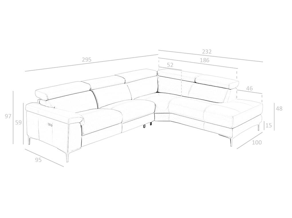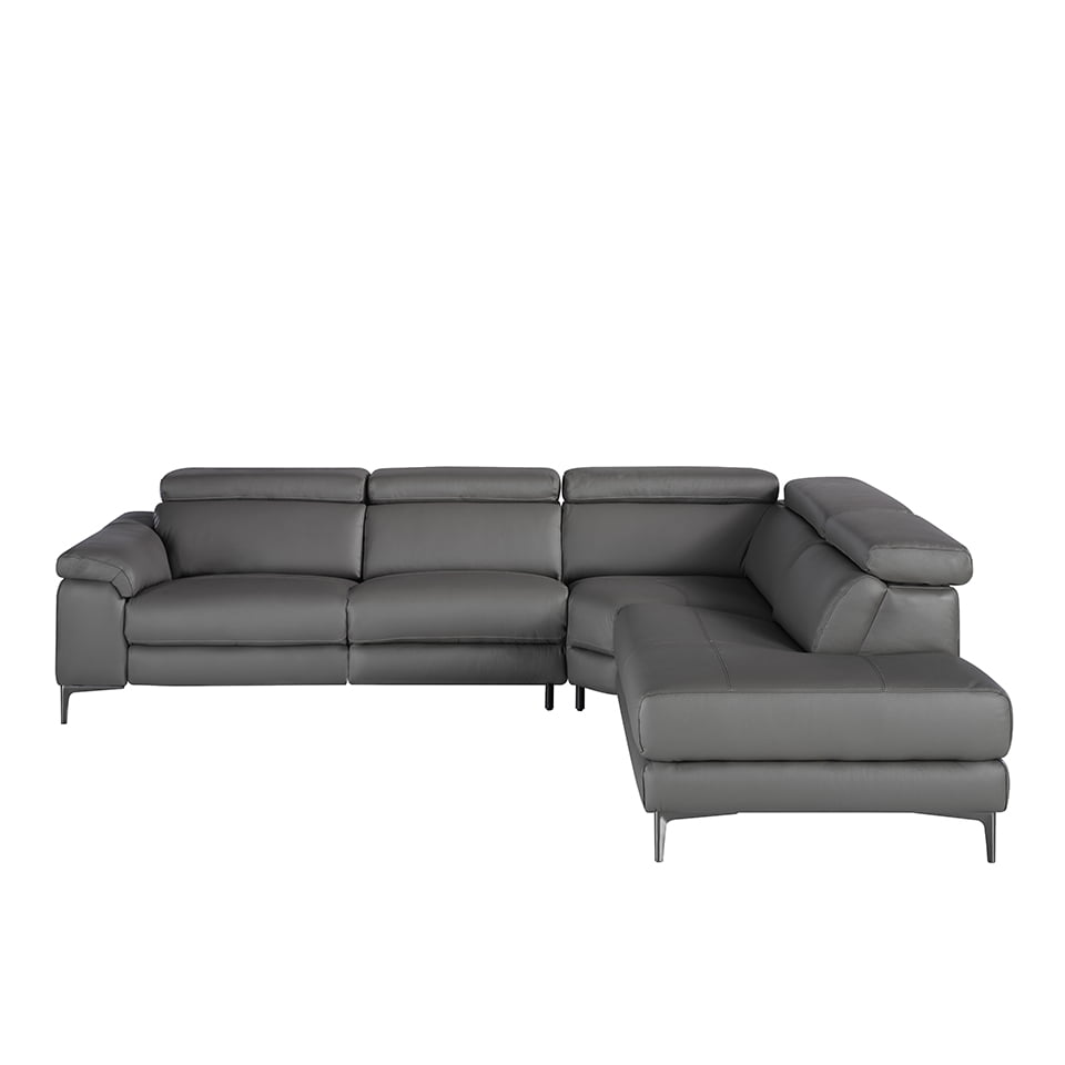 Aceasta canapea de colt tapitata in piele gri este perfecta pentru cei care cauta un design modern si elegant pentru camera de zi. Fabricata din piele de vaca de 1 mm grosime si cu tetiere independente reglabile, aceasta canapea de colt ofera confort maxim si un aspect sofisticat. Cu o structura interna robusta din lemn de pin natural si picioare din otel vopsit negru cu epoxid, aceasta canapea de colt este durabila si functionala. Scaunul lateral cu mecanism de relaxare electric va ofera confortul suplimentar de care aveti nevoie pentru a va bucura de momentul de liniste si pace.