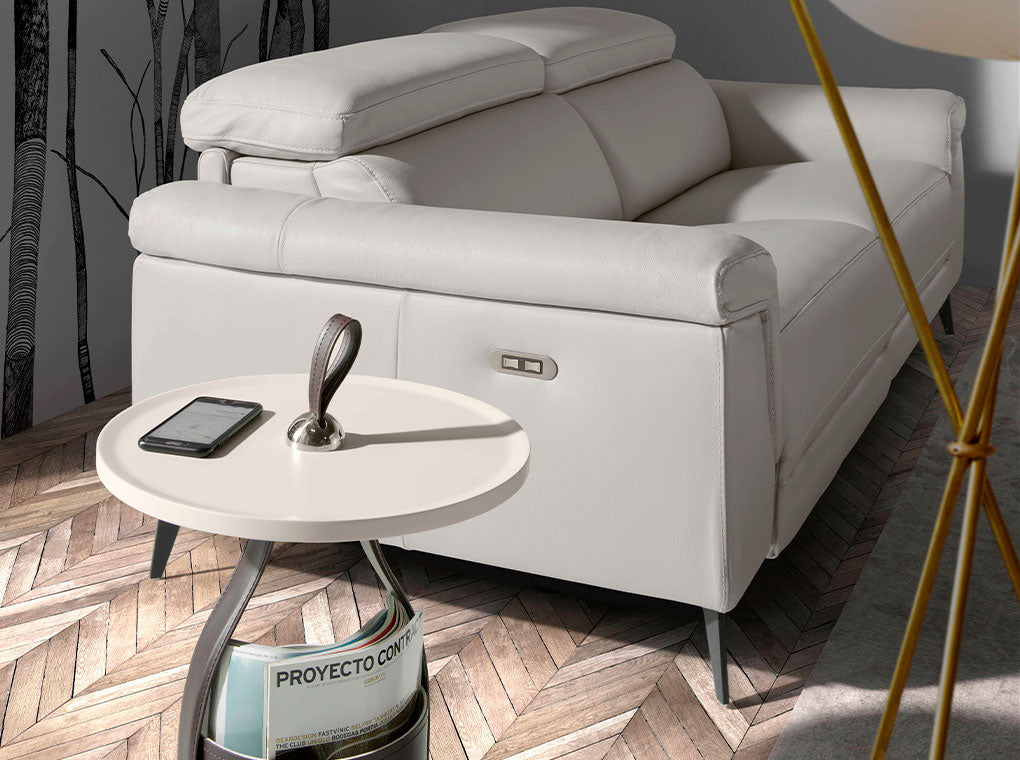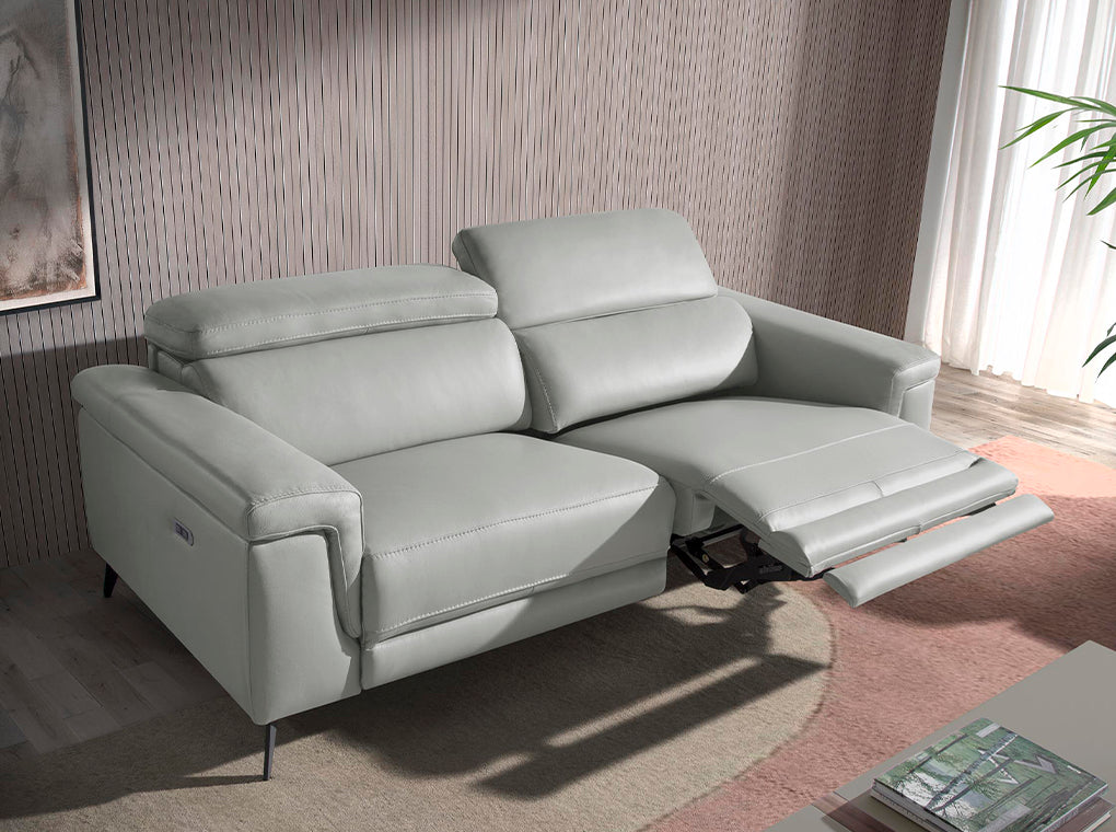 Aceasta canapea moderna cu 3 locuri tapitata in piele de vaca de cea mai inalta calitate este perfecta pentru a oferi sufrageriei dvs. un aspect original si personal. Designul sau cu brate ii permite sa se potriveasca in orice tip de sufragerie, devenind protagonistul principal al camerei. Fabricata din materiale de cea mai inalta calitate, aceasta canapea este durabila si functionala. Datorita designului sau original care combina tonuri calde precum pielea de vaca si picioarele din otel vopsit in epoxid negru, este canapeaua perfecta pentru a oferi echilibrul perfect intre stil si confort. Cu scaunele sale confortabile si mecanismele de relaxare electrice, aceasta canapea va va permite sa aveti confortul maxim, fara a lasa deoparte cea mai inalta tendinta.