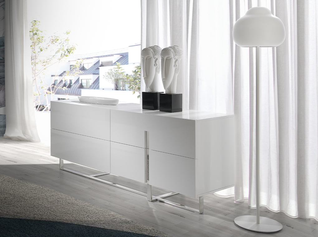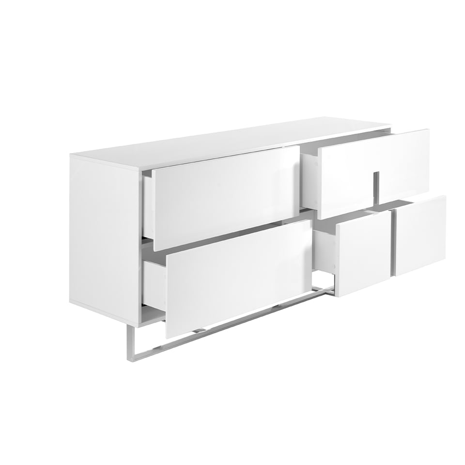 Acest bufet alb cu picioare din otel este perfect pentru cei care cauta un design modern si elegant in casa lor. Cu o structura din DM lacuita in alb lucios si picioare din otel inoxidabil cromat, acest bufet ofera o senzatie de spatiu si lumina in orice living sau sufragerie. Cu patru sertare duble cu sistem de inchidere moale, acest bufet ofera o capacitate mare de depozitare, pastrand totul in ordine. Realizat din cele mai bune materiale de calitate, acest bufet este durabil si functional.