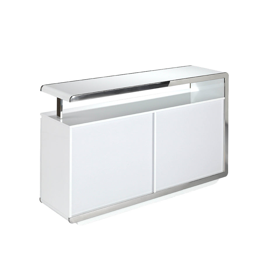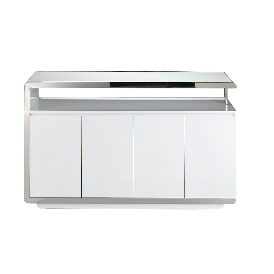 Acest bufet alb cu structura din otel este un produs modern si elegant, perfect pentru a aduce un plus de stil in orice camera de zi sau de mese. Fabricat din materiale de cea mai inalta calitate, acesta ofera un spatiu mare de depozitare, cu patru usi duble cu sistem de inchidere moale si rafturi interioare asortate din MDF lacuit alb. Designul sau inovator, cu detalii din otel inoxidabil cromat de 22 microni, ii confera un aspect avant-garde si trendy, fiind ideal pentru a crea o atmosfera spatioasa si luminoasa in orice incapere.