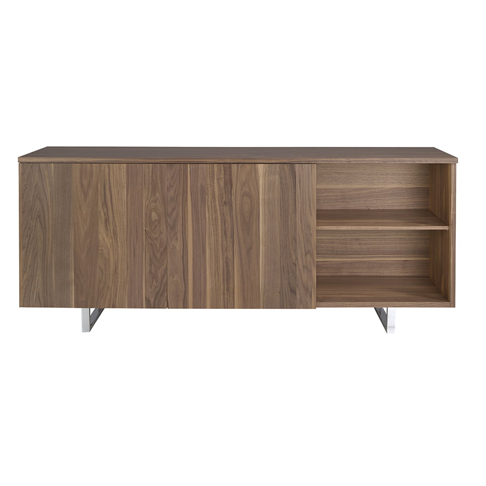 Bufetul din nuc cu picioare din otel este un mobilier modern si elegant, perfect pentru a aduce un plus de stil si caldura in camera dvs. Este multifunctional si se potriveste in orice tip de living sau sufragerie. Realizat din cele mai bune materiale de calitate, acest bufet garanteaza durabilitate si functionalitate. Designul sau cu linii drepte si picioarele elegante din otel cromat ofera un aspect modern si confortabil. Cu patru sertare cu sistem de impingere si inchidere cu inchidere moale, usi glisante laterale si rafturi interioare, acest bufet este ideal pentru a pastra totul in ordine si in locul sau.