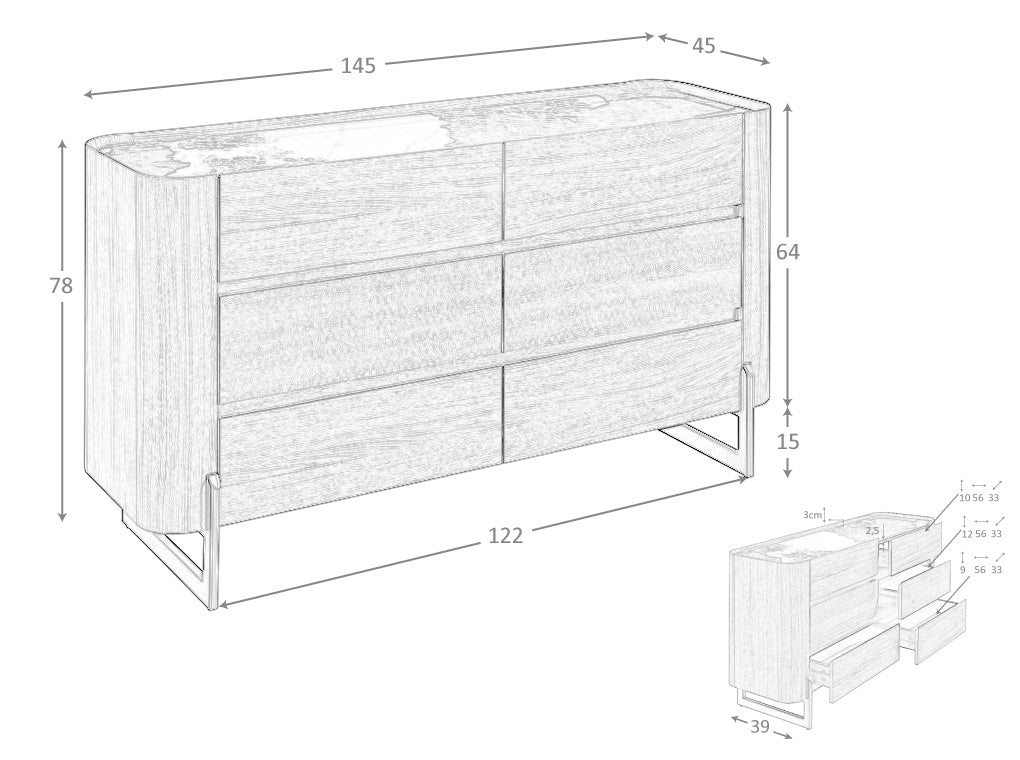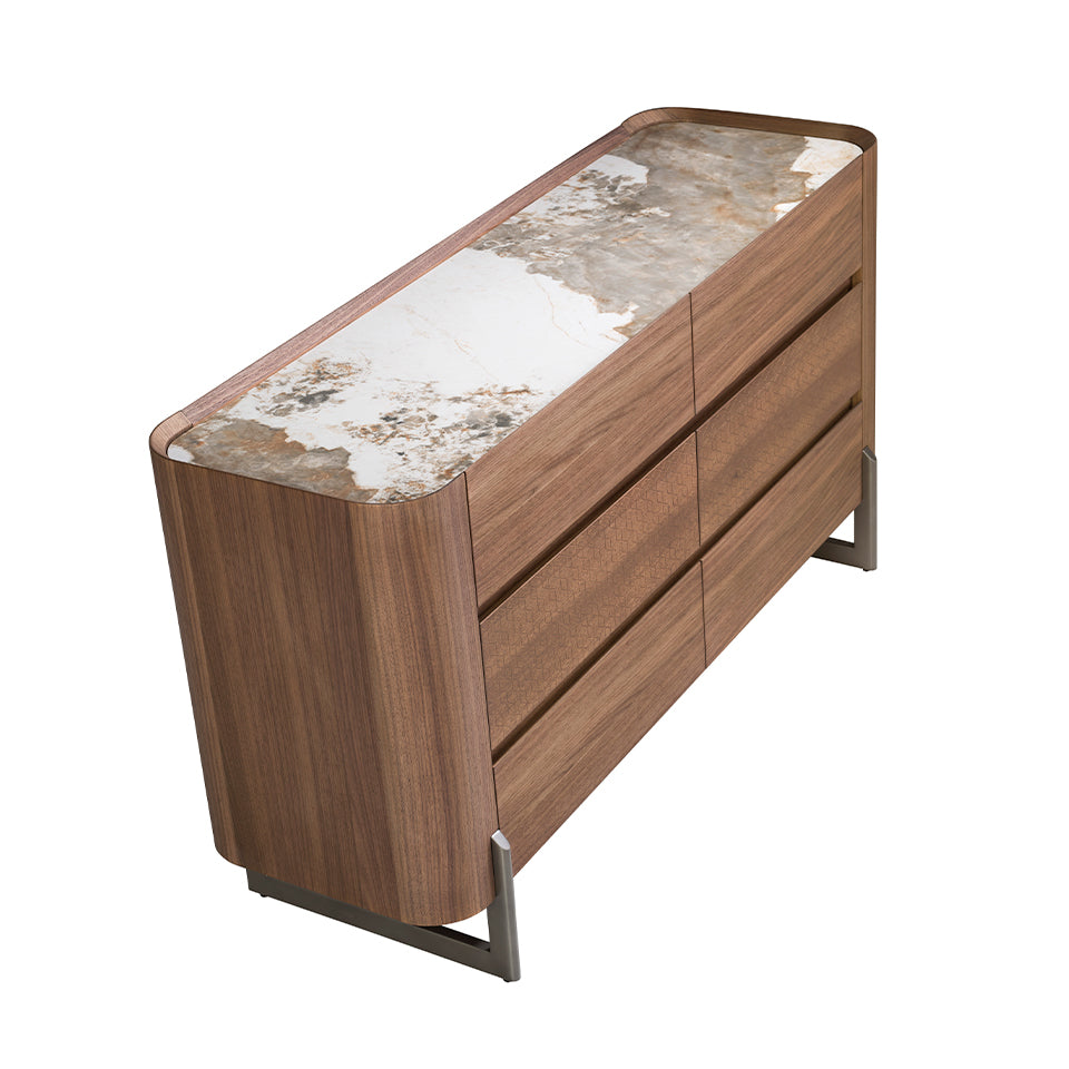 Comoda cu sertare din nuc si otel intunecat este un mobilier elegant si modern, perfect pentru a aduce o atingere diferita si sofisticata in casa dvs. Cu un design liniar si picioare din otel inoxidabil intunecat, aceasta comoda se potriveste in orice spatiu. Realizata din materiale de cea mai inalta calitate, are o placa de marmura de portelan alb cu vene gri si maro in finisaj lucios, care ii confera un design total distinctiv si avangardist. Cu 6 sertare cu sistem soft close, aceasta comoda este practica si functionala, oferind suficient spatiu de depozitare pentru a pastra totul la locul sau. Gravura originala cu motive geometrice pe sertarele sale il face si mai special si unic. Cautati mobilierul perfect de designer pentru dormitorul dvs.? in catalogul nostru veti gasi cea mai buna selectie de noptiere, comode, sifoniere sau masute de noapte pentru a adauga o atingere unica si originala casei dvs.