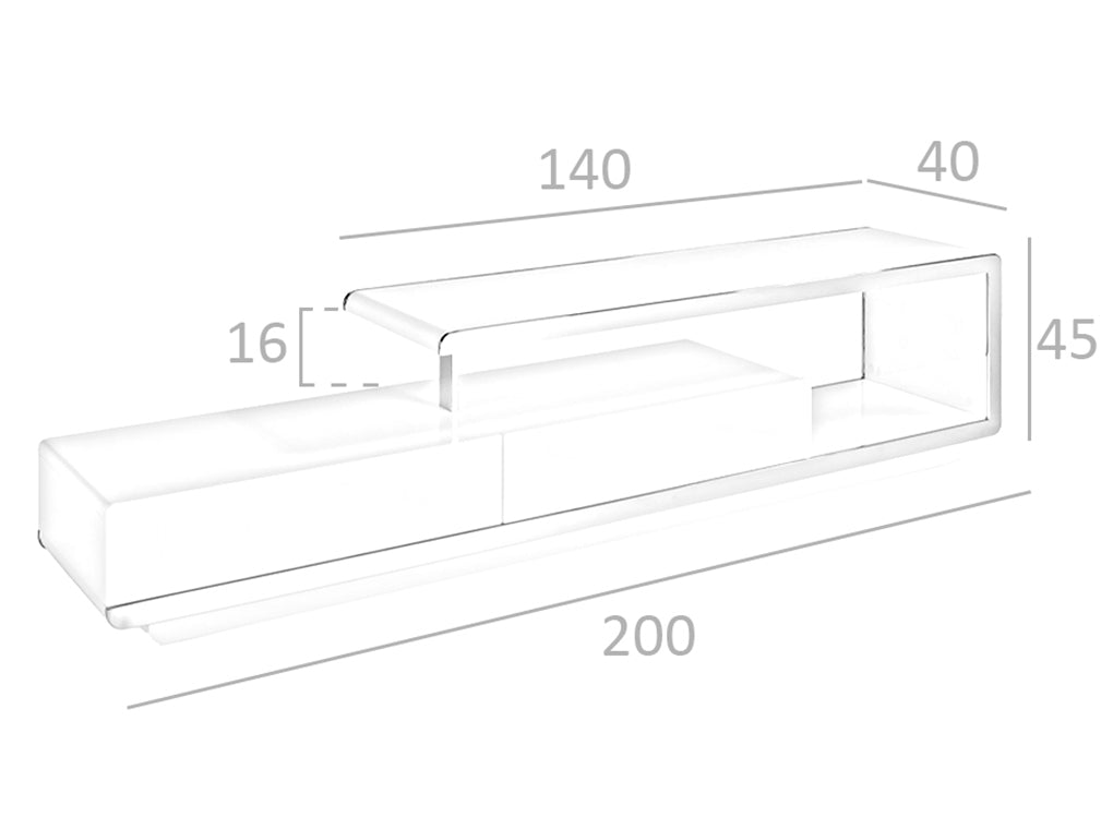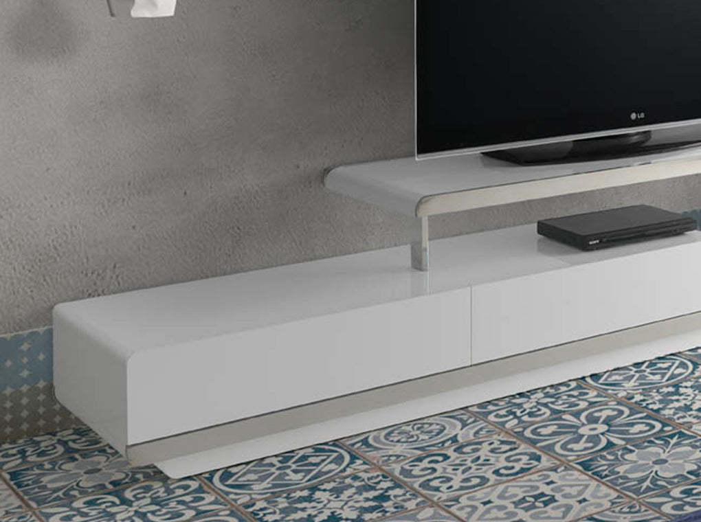 Mobilierul TV alb si din otel este perfect pentru a crea o atmosfera spatioasa si luminoasa in camera de zi. Designul sau modern si original, realizat din DM lacuit lucios alb RAL9003 si detaliile din otel inoxidabil cromat de 22 microni, ii ofera o atingere eleganta, moderna si minimalista. Acest mobilier TV este multifunctional si functional, fiind perfect pentru a fi combinat cu cele mai recente tendinte in decorare. Toate mobilele noastre pentru televizoare sunt realizate din materiale de cea mai inalta calitate, garantand mobilier durabil si functional. Cu linii drepte si simple, acest mobilier TV cu detalii in structura de otel cromat va fi perfect pentru a oferi acea atingere de stil si sofisticare pe care o cautati, fara a neglija functionalitatea si practicitatea. Datorita dimensiunilor sale de structura, precum si spatiului sau de depozitare cu o unitate dubla de sertare cu sistem de inchidere moale, acest mobilier TV va stabili tendinte si personalitate, oferind in acelasi timp spatiu si lumina in spatiu.