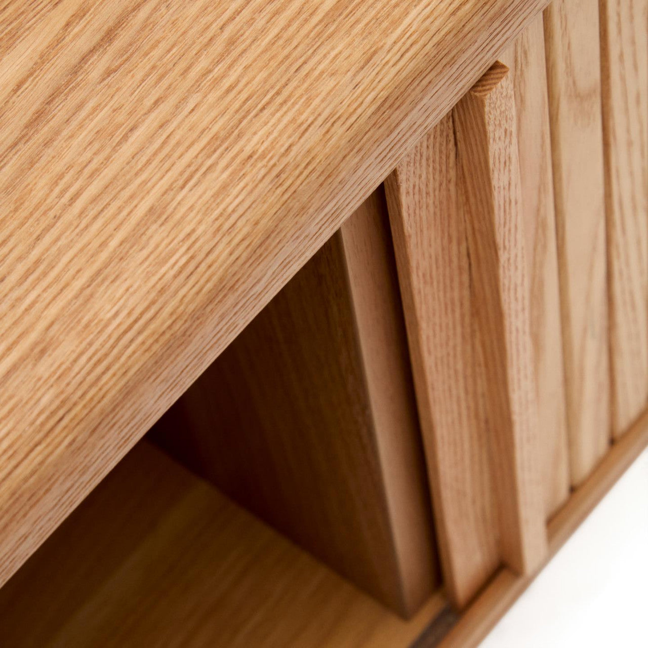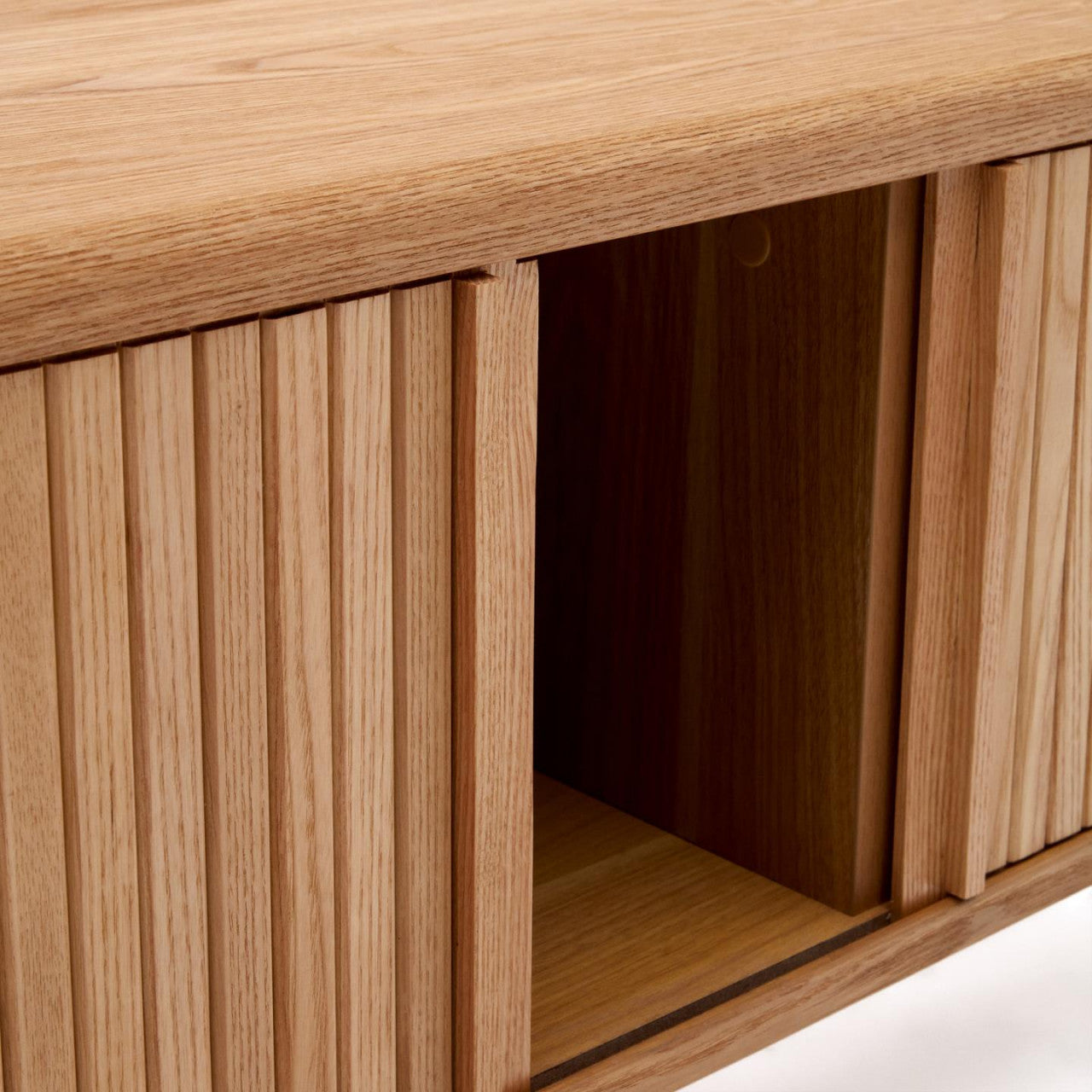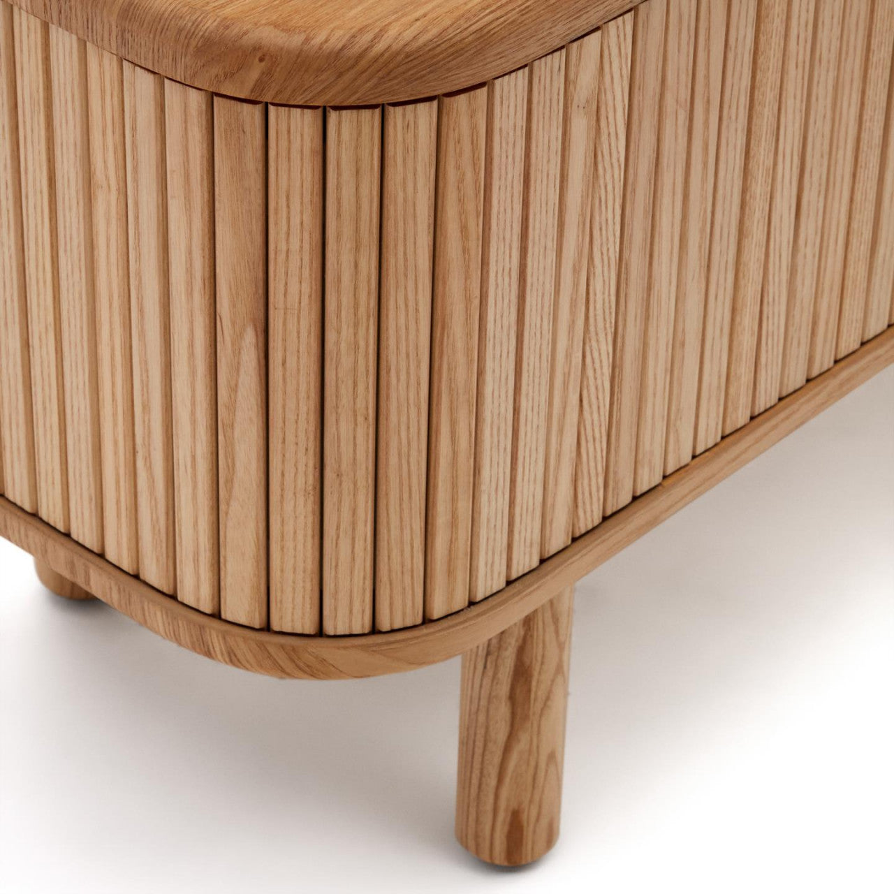 Echipa Kave Home a creat colectia Mailen, cu un design contemporan de forme rotunjite, din furnir de frasin si usi glisante din sipci din lemn care o fac o vedeta autentica.