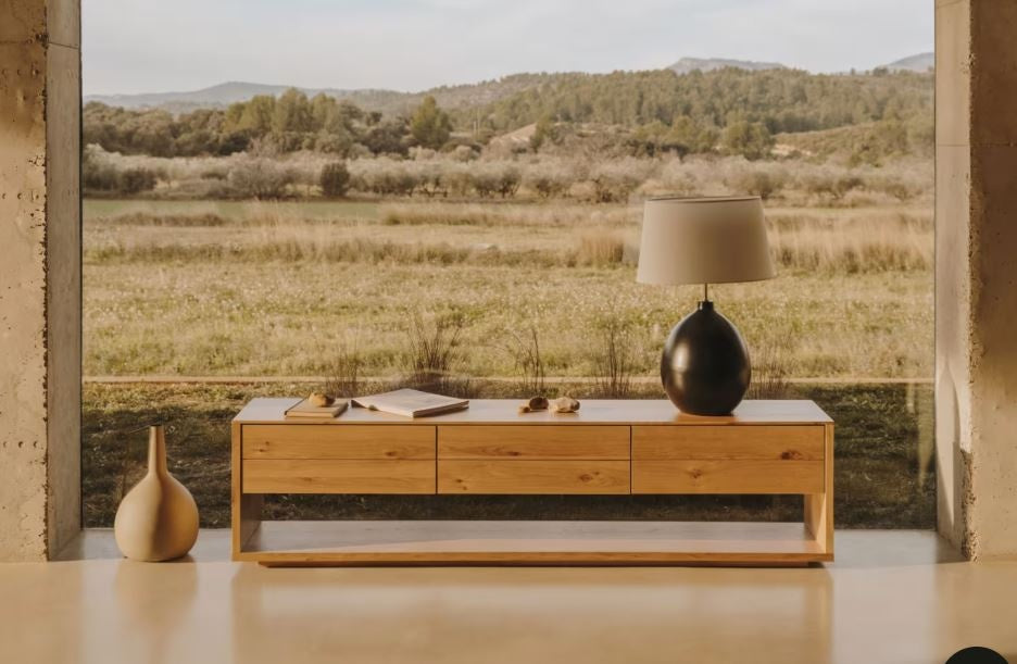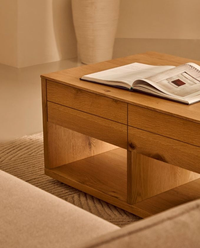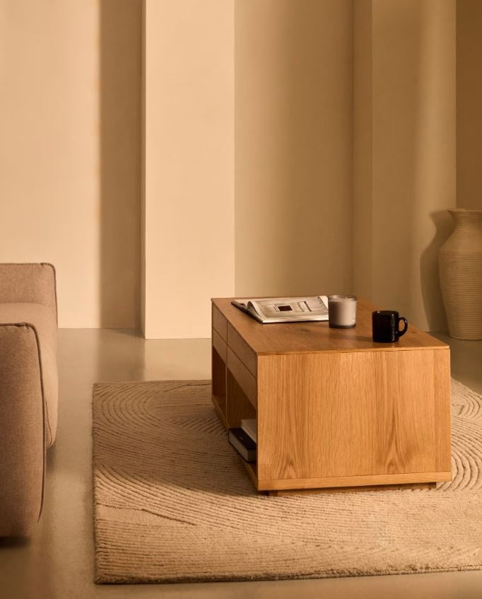 Echipa Kave Home a proiectat Alguema, o colectie care evoca calmul si linistea datorita stilului sau minimalist si finisajului furniruit din stejar natural.