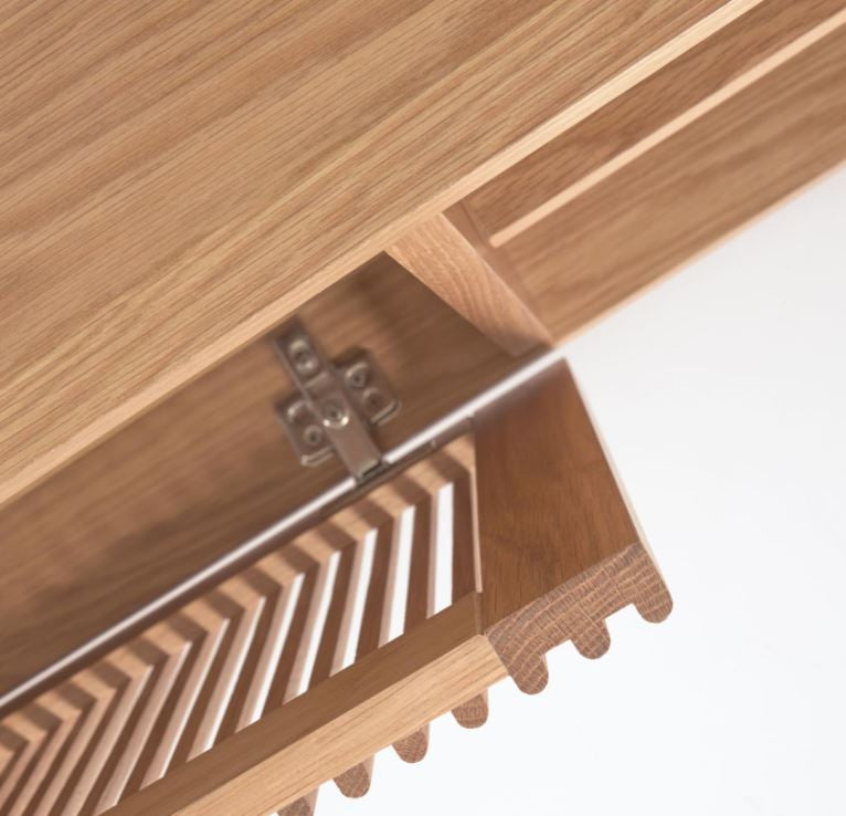 Proiectat de echipa Kave Home, Beyla combina esenta naturala a stejarului cu sipci verticale originale din lemn de pe usi pentru a crea un joc de lumini si umbre. Si, desigur, este facuta cu atentia la detalii pe care o merita un design grozav.