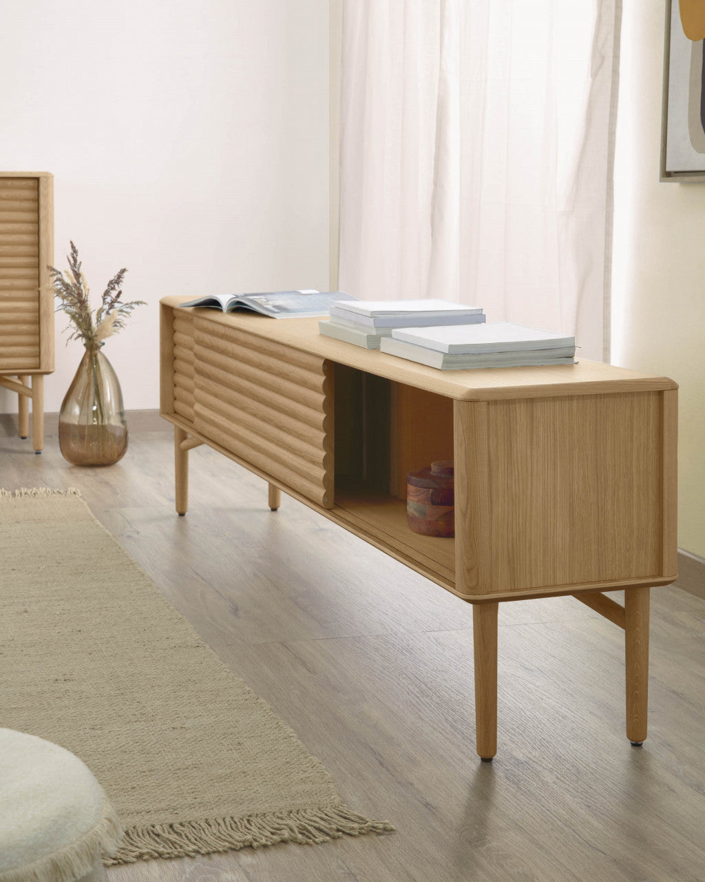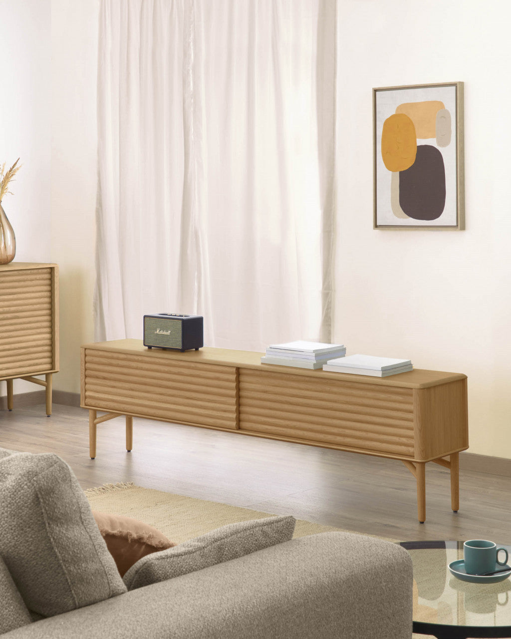 Calitatea este in fiecare centimetru al comodei TV Lenon, fabricat in Europa din lemn masiv cu furnir de stejar durabil. Acest design unic are margini rotunjite si reliefuri pe usi. Farmecul lemnului la maxim.
