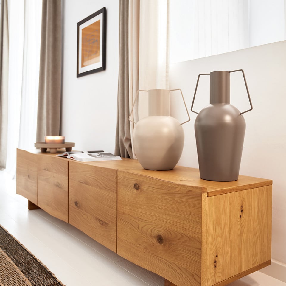 Taierea neregulata a furnirului de stejar durabil al lui Rasha il face cu totul unic. Un design Kave Home care pune lemnul in fata si in centru pentru a dezvalui tonuri, forme si granulatii unice si ale carui margini curbate creeaza forme organice, exclusive.