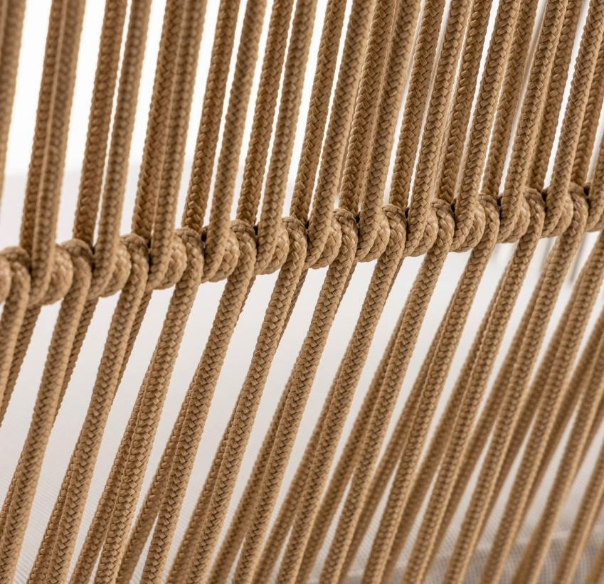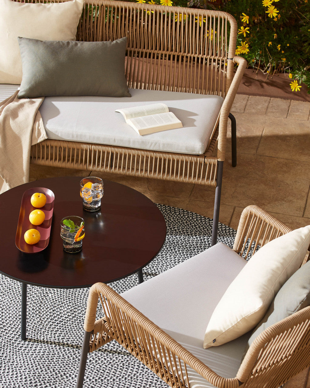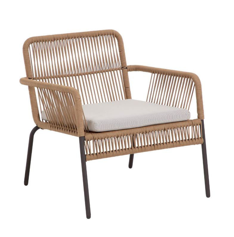 Fotoliul exterior Samanta este o creatie a designerului Tapio Anttila pentru Kave Home. O piesa de designer care se potriveste atat in cat si in interior. Structura sa este realizata din otel galvanizat, material care poate rezista la razele UV, si din sfoara de poliester bej care au fost impletite manual pe scaun. De asemenea, vine cu o perna maro detasabila cu material impermeabil pentru scaun.