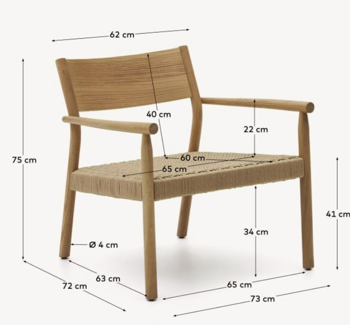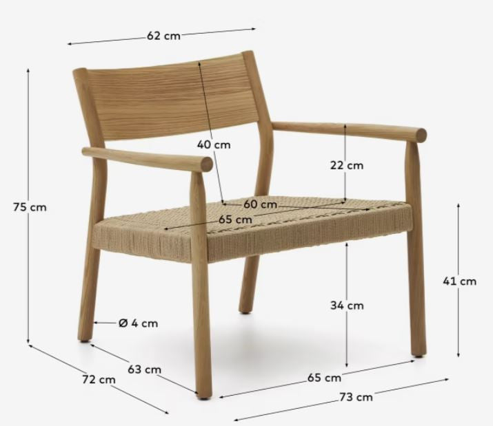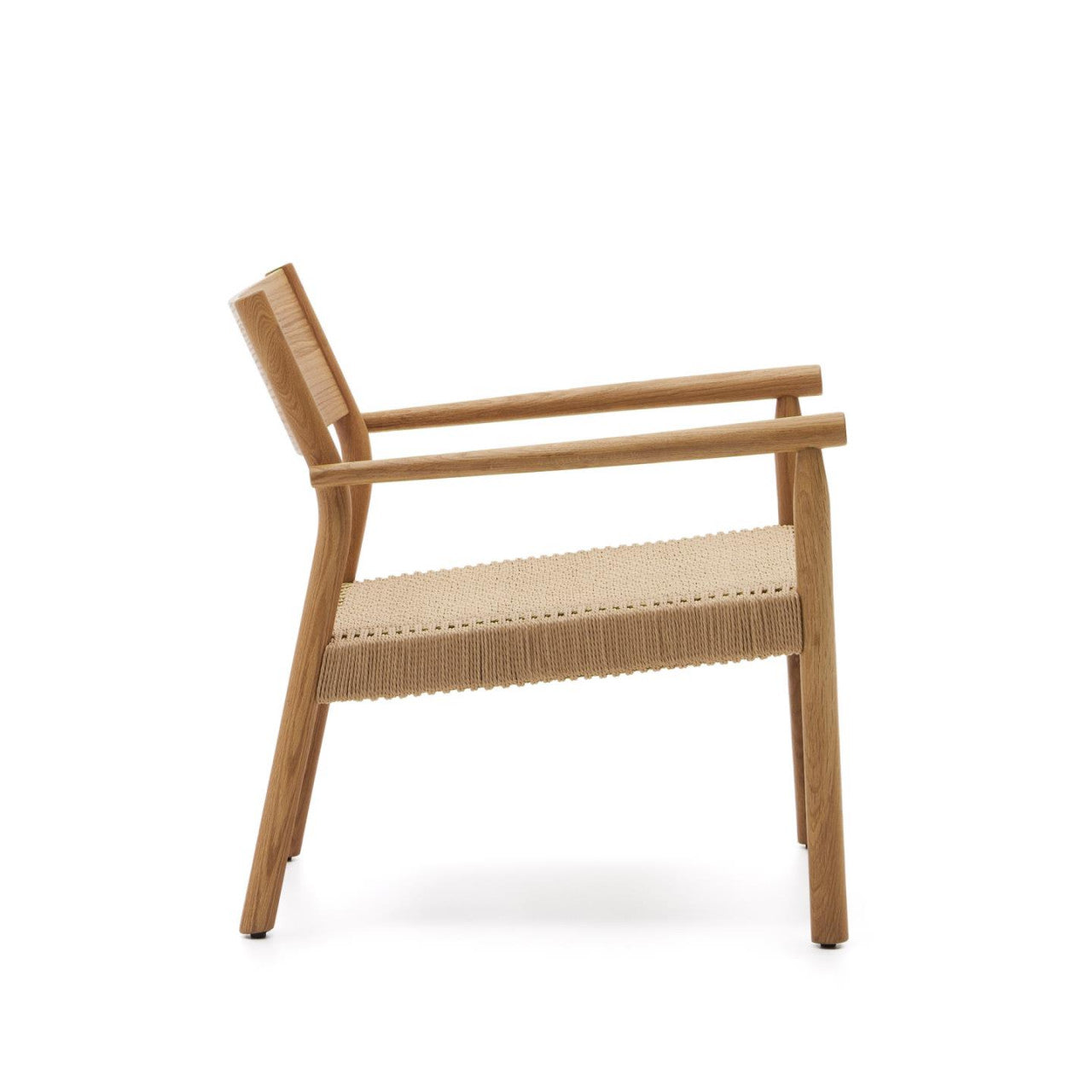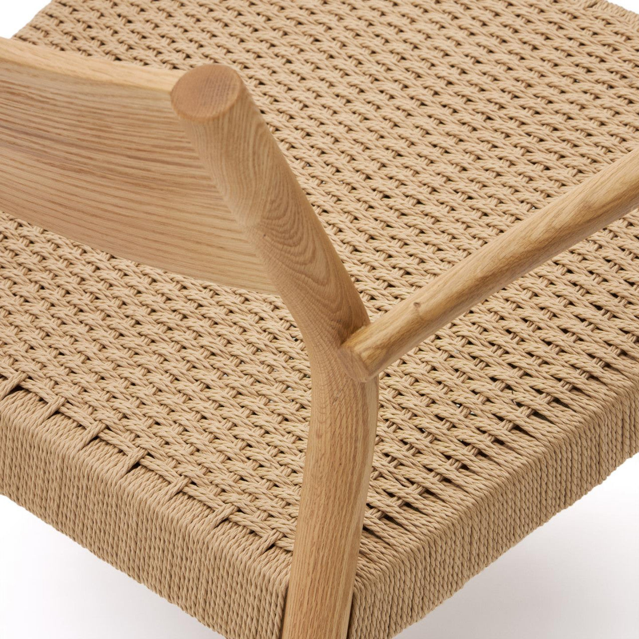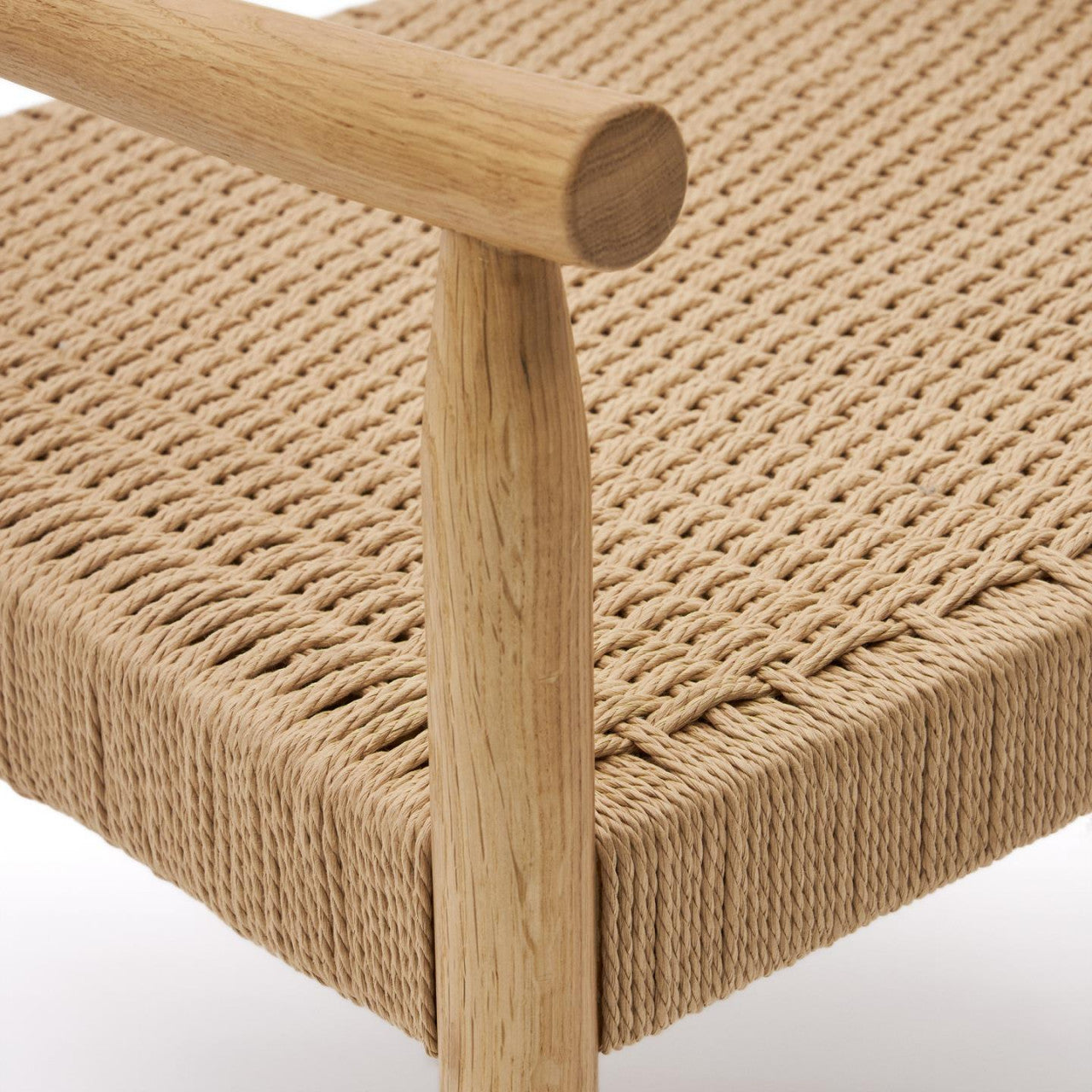 Fotoliul Yalia este un design artizanal, cu o structura din lemn masiv de stejar si un scaun realizat din franghie de hartie tesuta manual. Materialele sale sunt, de asemenea, ecologice.