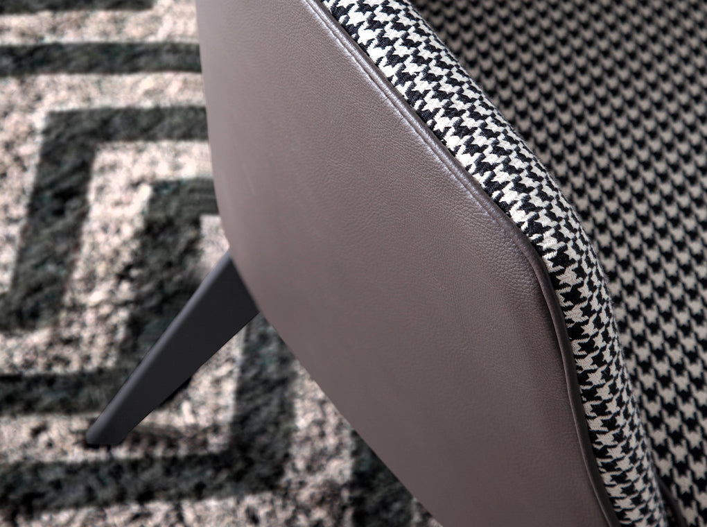 Fotoliul tapitat cu tesatura cu model houndstooth este un produs modern si elegant, perfect pentru zona de odihna si relaxare. Tapiteria sa originala si marginile negre, impreuna cu spatele tapitat cu piele ecologica de culoare maro inchis, ii confera un aspect sofisticat si avant-gardist. Fotoliul este realizat cu cele mai inalte standarde de calitate, garantand mobilier durabil si functional. Designul sau versatil ii permite sa se potriveasca in orice tip de living, zona de lectura sau dormitor, devenind protagonistul principal al camerei. Confortul este asigurat de spuma de poliuretan cu densitate de 25 kg / m3 pentru spate si scaun.