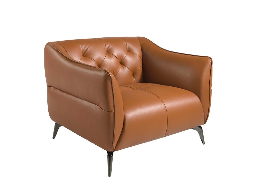 Fotoliul nostru tapitat in piele maro cu model capitonné este un produs de design modern, realizat din piele de bovina de 1,25 mm grosime, culoare maro Earth Clay, cu spate si sezut capitonné. Structura sa de picioare din otel intunecat aduce un touch de avangarda si eleganta in orice camera. Fabricat cu materiale de cea mai inalta calitate, acest fotoliu este versatil si functional, potrivindu-se in orice tip de living sau sufragerie, zona de lectura sau dormitor. Dimensiunea scaunelor sale si umplutura sa de spuma poliuretanica de 25 kg/m3 va vor permite sa aveti confort maxim, fara a lasa deoparte ultimele tendinte.