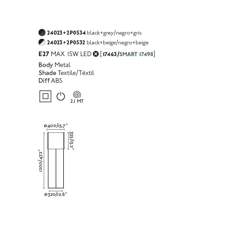 Descriere | baza metal finisaj negru, abajur textil gri antracit, diff. ABS |