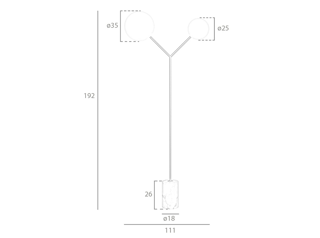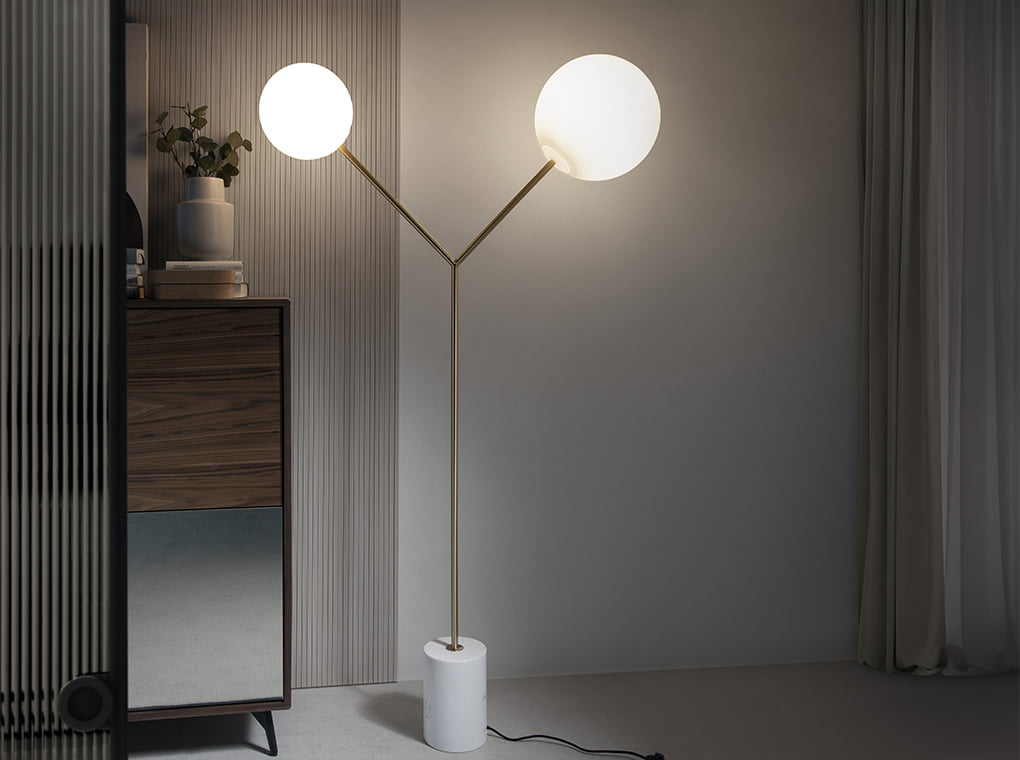 Lampadarul din marmura alba, otel auriu si sticla alba este un model modern si elegant, perfect pentru a aduce o nota de caldura si spatiu in casa ta. Baza din marmura portelanata similara cu calacatta si corpul din otel inoxidabil auriu ofera o combinatie perfecta de stil si practicitate. Lampadarul este versatil si se potriveste cu cele mai recente tendinte in decor. Este fabricat din materiale de cea mai inalta calitate, garantand durabilitate si functionalitate. Designul sau avangardist este ideal pentru a transmite personalitatea ta. Lampadarul are doua becuri LED neincluse si inlocuibile E27 de 13W-3000K, putere 230V si 50 Hz, IP: clasa II 20, rating energetic A++. Lungimea cablului este de 250 cm.