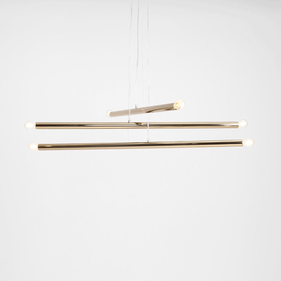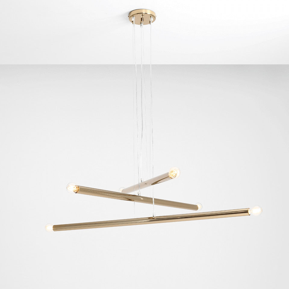Lustra moderna Tubo 6 Gold este un tub de trei metri lungime, suspendat liber in diferite directii, cu 6 surse de lumina E14. Acest model, cu o estetica remarcabila si un finisaj auriu frumos si delicat, va fi o alegere perfecta pentru cunoscatorii de design bun si de interioare elegante.
