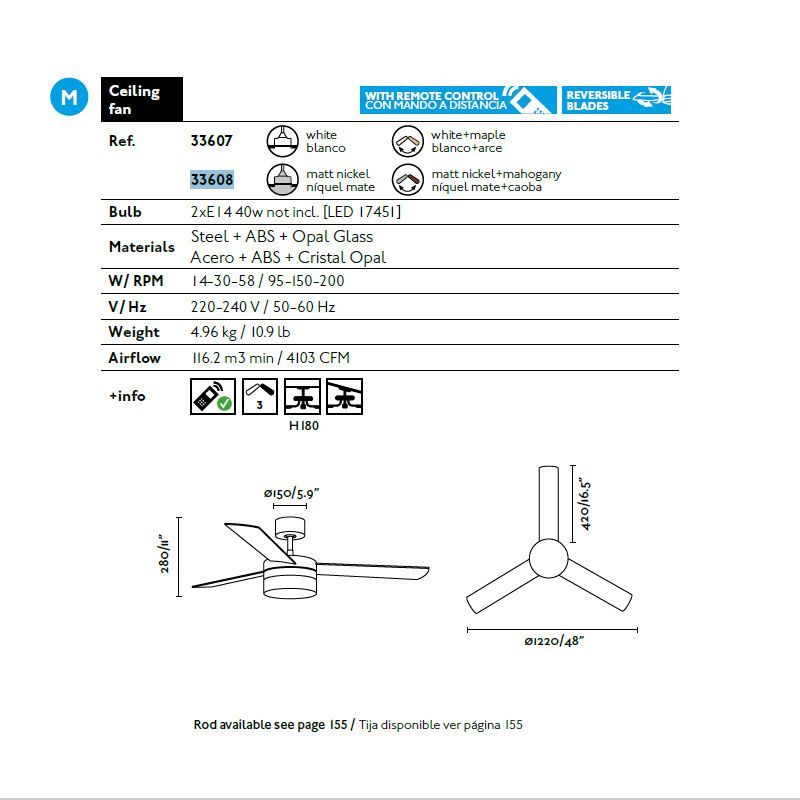 Materiale | motor din otel, lame din ABS reversibile in finisaj nichel si mahon, difuzor sticla opal |
