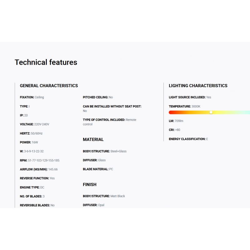 Materiale | metal, sticla, palate PC negre, difuzor opal |