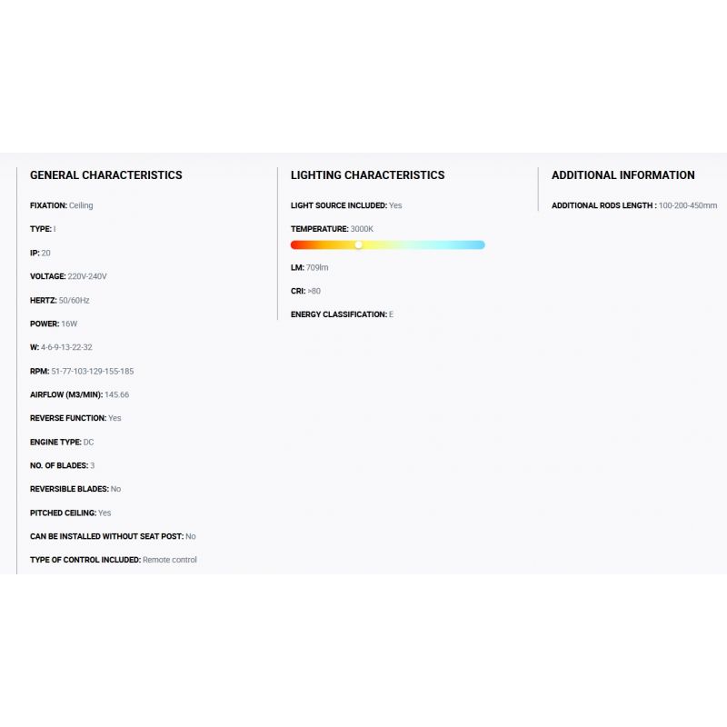 Informatii produs: | lustra cu ventilator si telecomanda, cu functie reversibila iarna-vara, 6 trepte de viteza reglabile 4-6-9-13-22-32Watt si 51-77-103-129-155-185rpm |