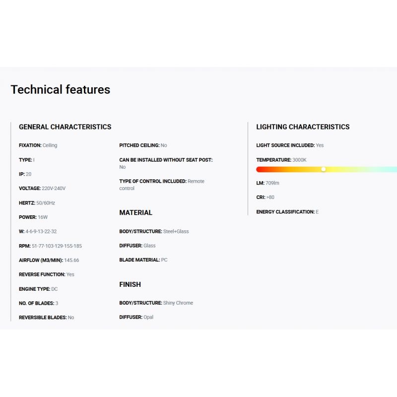Informatii produs: | lustra cu ventilator si telecomanda, cu functie reversibila iarna-vara, 6 trepte de viteza reglabile 4-6-9-13-22-32Watt si 51-77-103-129-155-185rpm. |