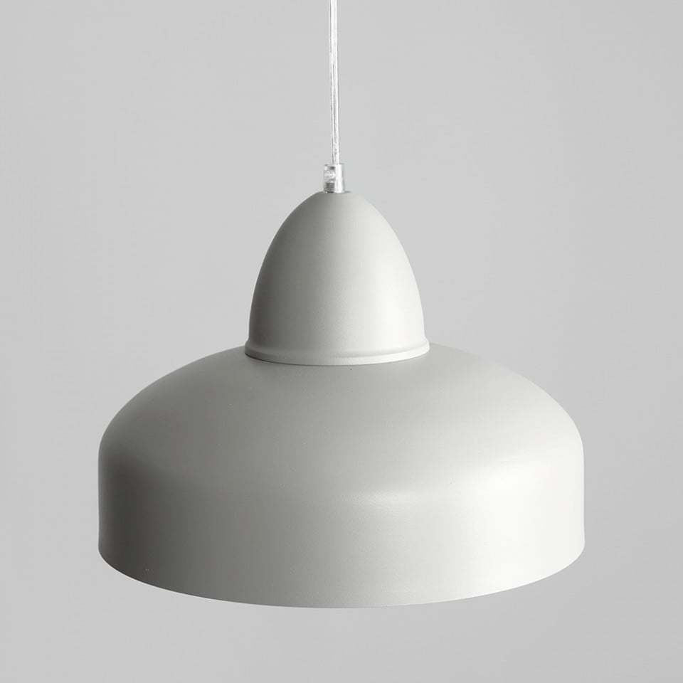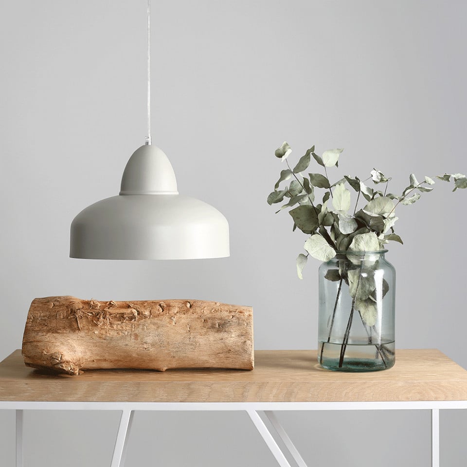 Lustra cu un aer industrial, acoperita cu pulbere de culoare gri deschis. Forma simpla si eleganta si lumina calda emisa de abajur vor face mai placute momentele petrecute acasa.