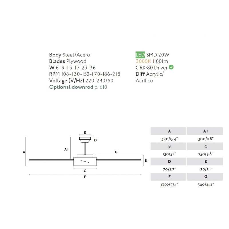 Descriere | motor din otel finisaj alb, lame plywood nuanta alba, difuzor acrilic alb |