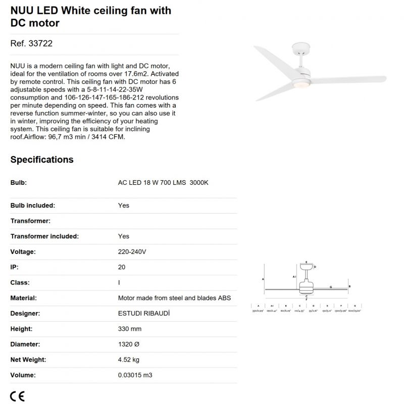 Descriere | motor din otel AC finisaj alb mat, lame din ABS nuanta alb mat, difuzor acrilic alb |