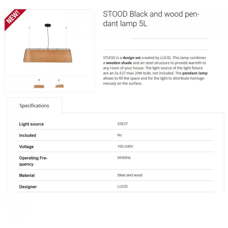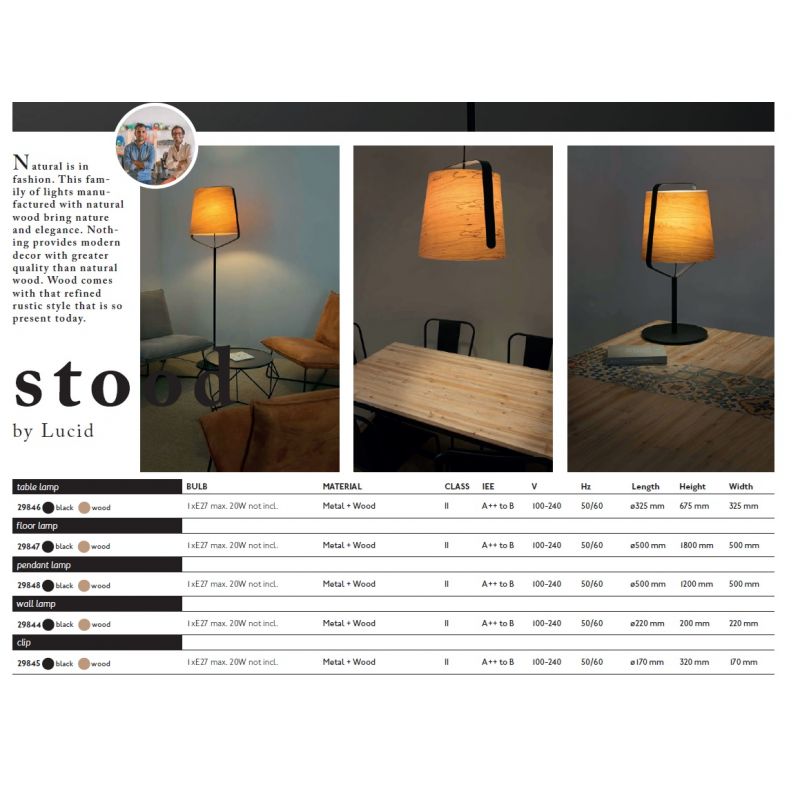 Materiale | cadru metal finisaj negru, abajur lemn ce permite distribuirea luminii pe suprafata omogena |