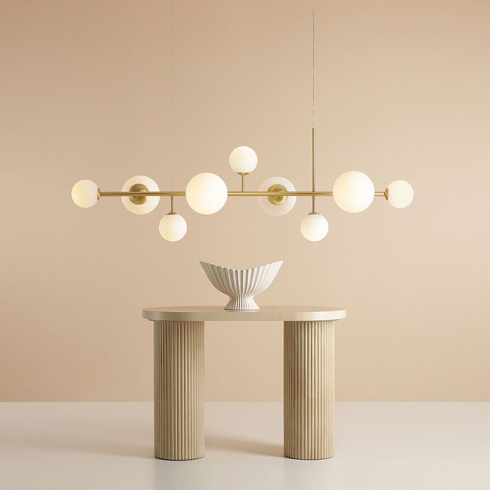 Lustra Dione, din sticla si metal, cu 9 becuri, este o piesa impresionanta ce combina eleganta materialelor de calitate cu un design modern si sofisticat. Abajururile din sticla permit o iluminare difuza si placuta, in timp ce detaliile metalice adauga un contrast rafinat si un aer contemporan. Cele 9 becuri asigura o iluminare puternica si uniforma, ideala pentru incaperi mari, cum ar fi livinguri, dininguri sau holuri. Lustra Dione este perfecta pentru cei care doresc o piesa de iluminat de impact, ce adauga atat functionalitate, cat si un accent estetic deosebit in orice decor modern.