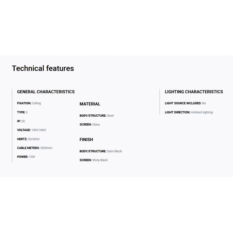 Materiale | structura metal negru satin, abajur sticla negru lucios |
