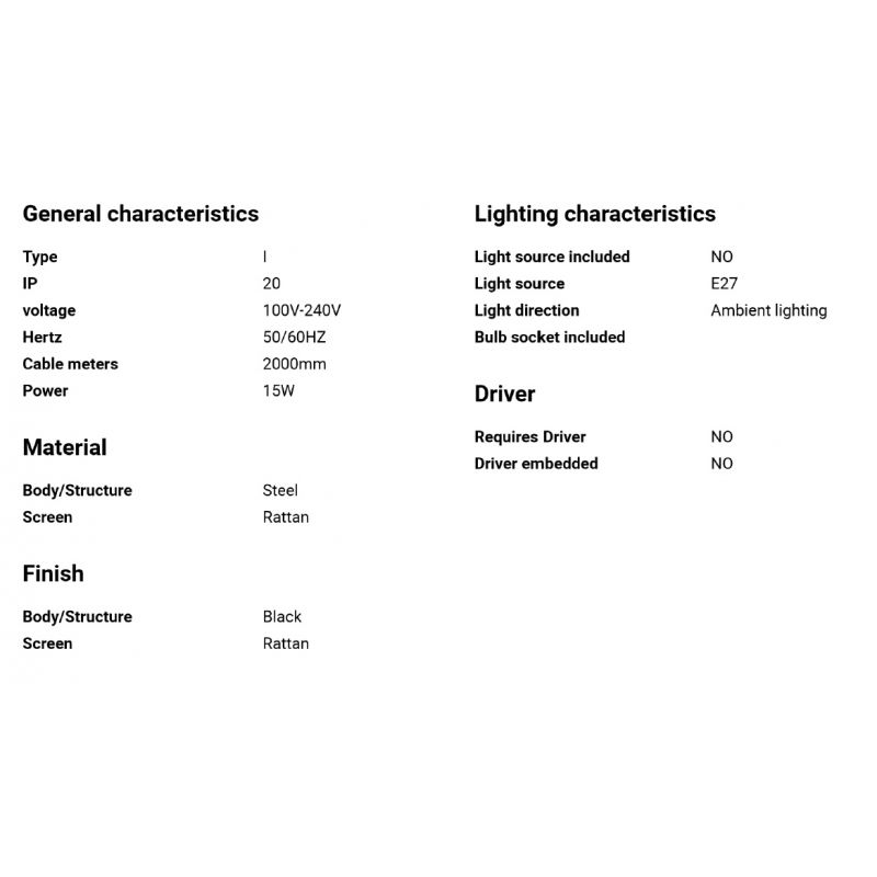 Descriere | structura din otel finisaj negru, abajur din fibre de ratan impletite |