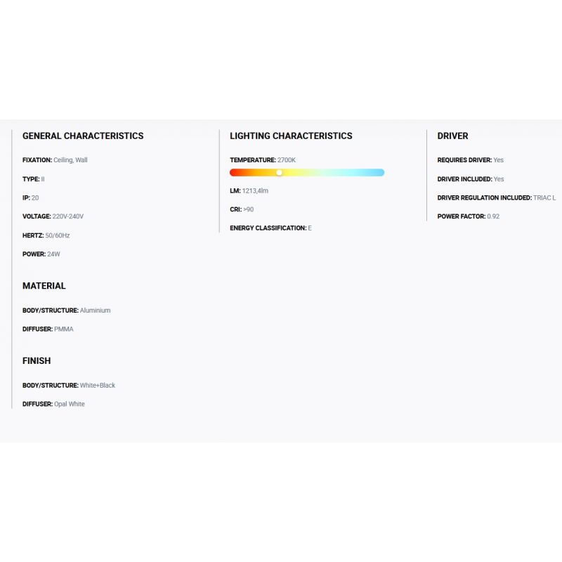 Materiale | aluminiu finisaj alb cu negru, difuzor PMMA alb opal |