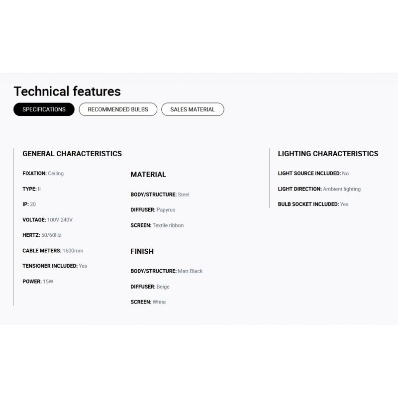 Materiale | otel negru mat, abajur panglica textila, difuzor papyrus, finisaj bej |