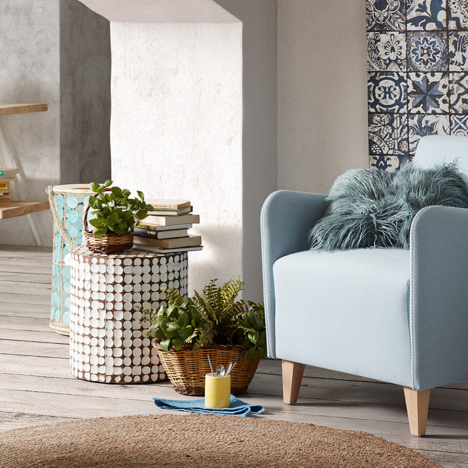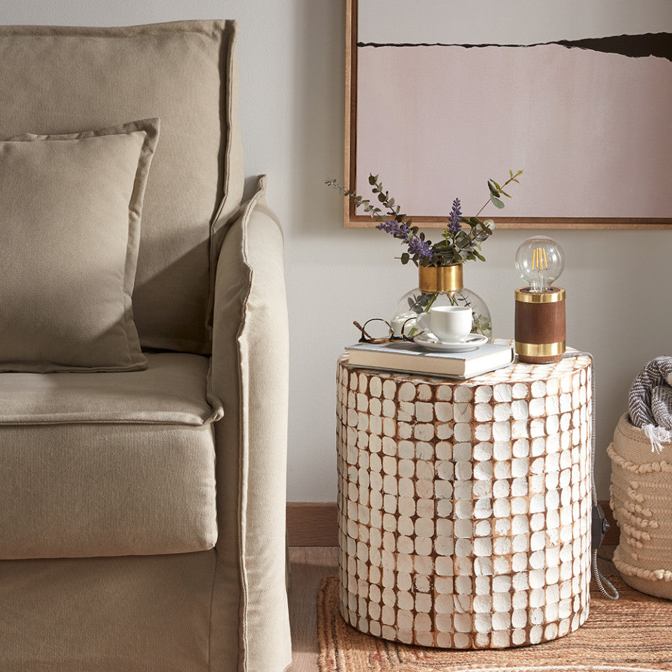 Masa laterala din lemn acoperita cu bucati de nuca de cocos.