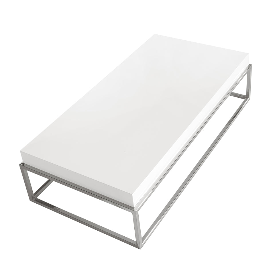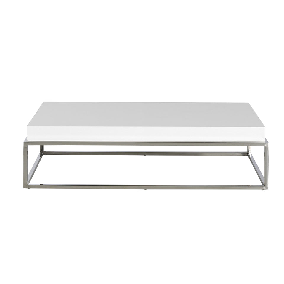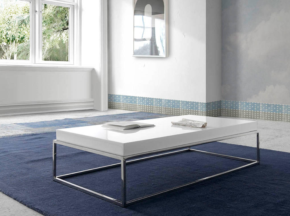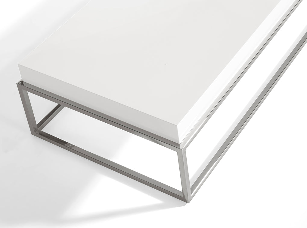 Masa de cafea cu design modern, cu blat in alb lucios si picioare de otel inoxidabil cromat de 22 microni. Este o piesa versatila si functionala, care va aduce un plus de modernitate si spatiu in camera de zi. Realizata cu cele mai inalte standarde de calitate, aceasta masa de cafea alba din lemn este o garantie pentru mobilier durabil si functional. Cu dimensiunile sale, este ideala pentru a imbraca camera de zi si pentru a oferi confort si eleganta.