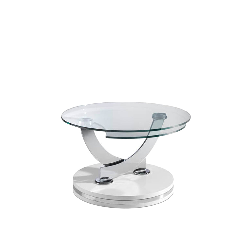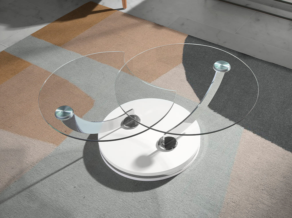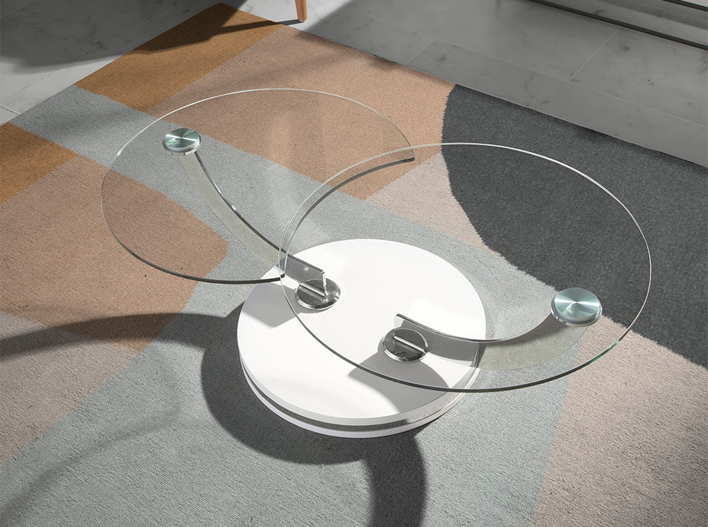 Masa de cafea pivotanta din sticla este o piesa de mobilier moderna si practica, cu doua blaturi fixe din sticla temperata si brate pivotante din otel inoxidabil cromat. Finisata cu o baza din MDF lacuita in alb lucios si detaliu din otel inoxidabil cromat, aceasta masa de cafea ofera stabilitate si stil pentru camera de zi. Este versatila si functionala, cu un design modern care se potriveste cu cele mai recente tendinte in decorare. Fabricata din materiale de cea mai inalta calitate, aceasta masa de cafea originala este perfecta pentru a transmite caracterul si personalitatea avangardista in fiecare dintre camerele dvs.