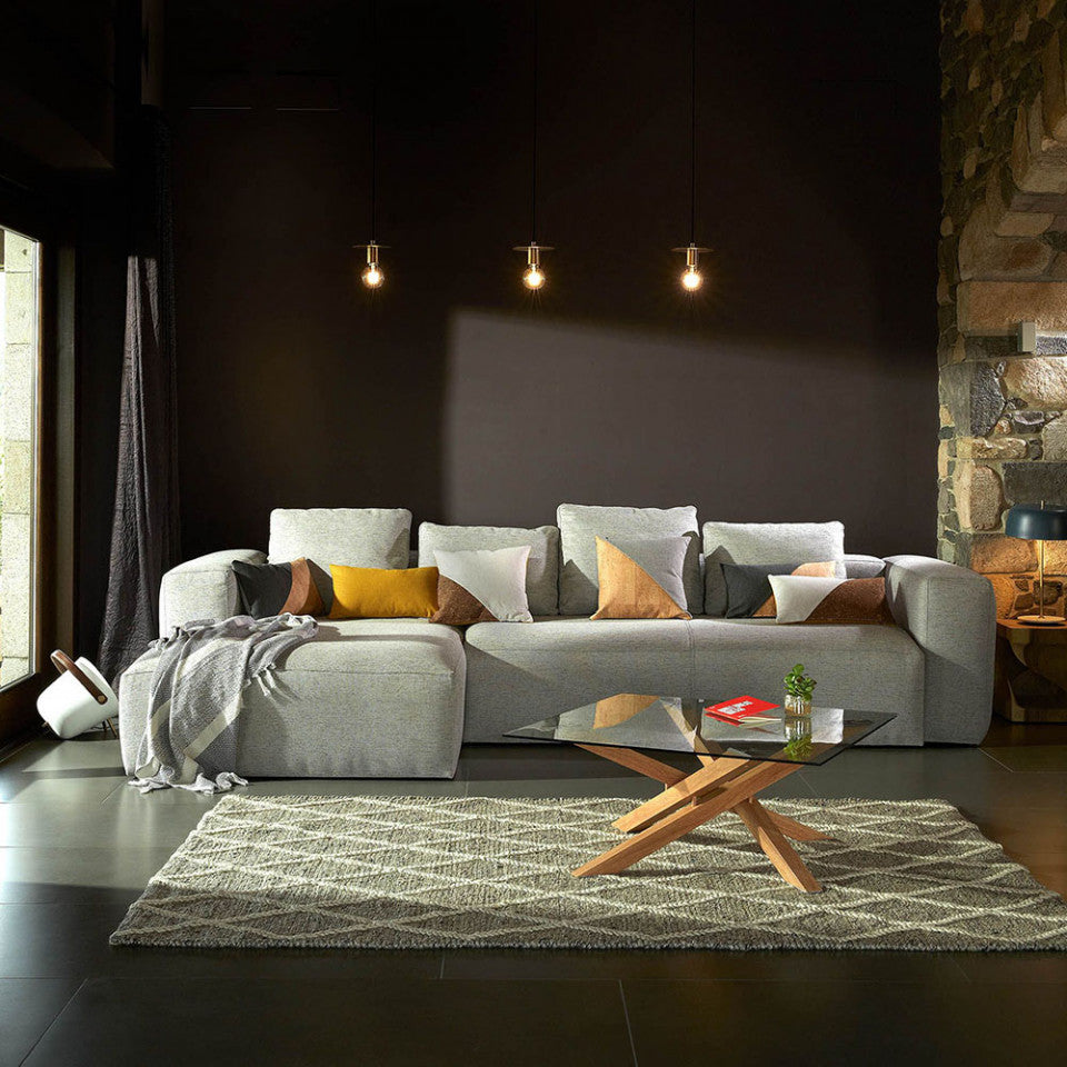 Masa pentru cafea iese in evidenta datorita stilului contemporan. Picioarele incrucisate din otel cu aspect de lemn se unesc cu sticla temperata cu grosimea de 10 mm pentru a aduce un aer de modernism oricarui spatiu.