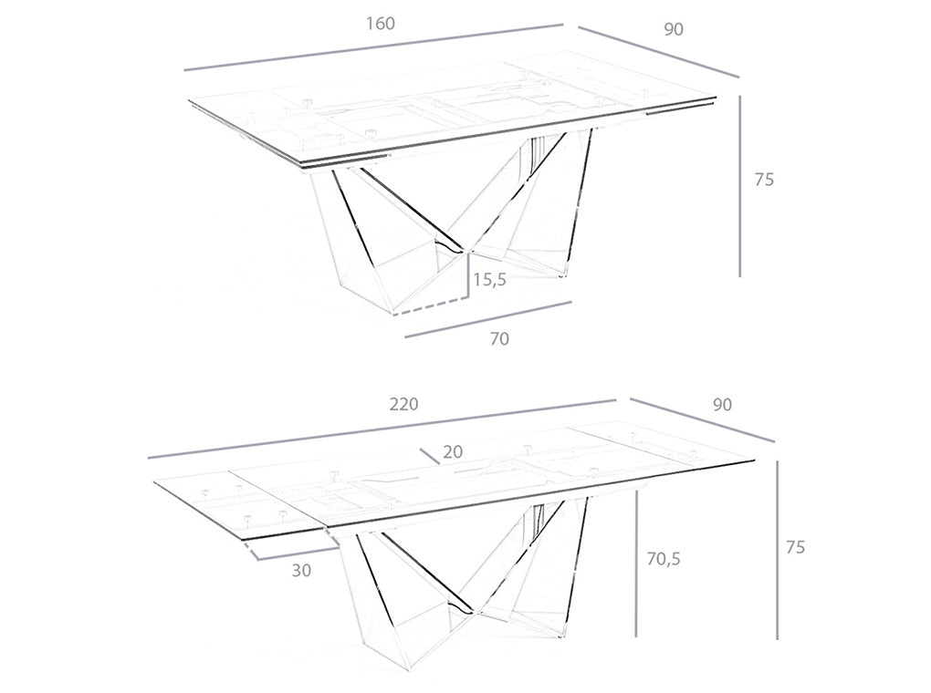 Aceasta masa extensibila de dining din sticla securizata de 10 mm cu margini lustruite si doua extensii de 30 cm este un element de design modern si inovator. Mecanismul de extensie vizibil si picioroarele din otel inoxidabil cromat de 22 microni fac din aceasta masa un element de decor versatil si functional. Calitatea sa superioara garanteaza mobilier durabil si functional, iar dimensiunile sale extensibile permit adaptarea la nevoile dvs. si organizarea evenimentelor sociale placute.
