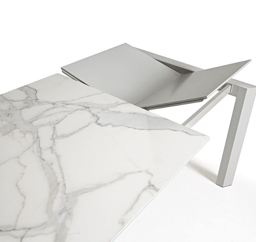 Masa dining extensibila alba din otel si portelan adauga un element de lux si modernitate in spatiul tau de luat masa. Cu un design sofisticat si atent la detalii, aceasta masa reprezinta o combinatie perfecta intre eleganta si utilitate.