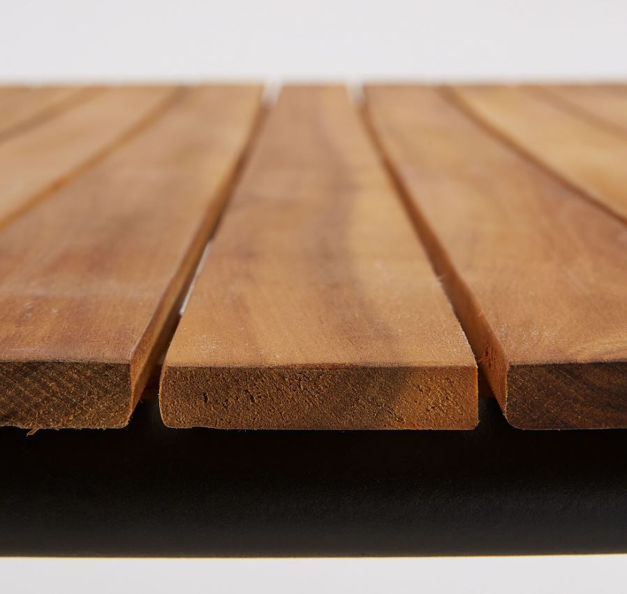 Masa cu structura din otel galvanizat vopsit cu pulbere. Blat din lemn natural de salcam. Pentru utilizare sub acoperire in interior .