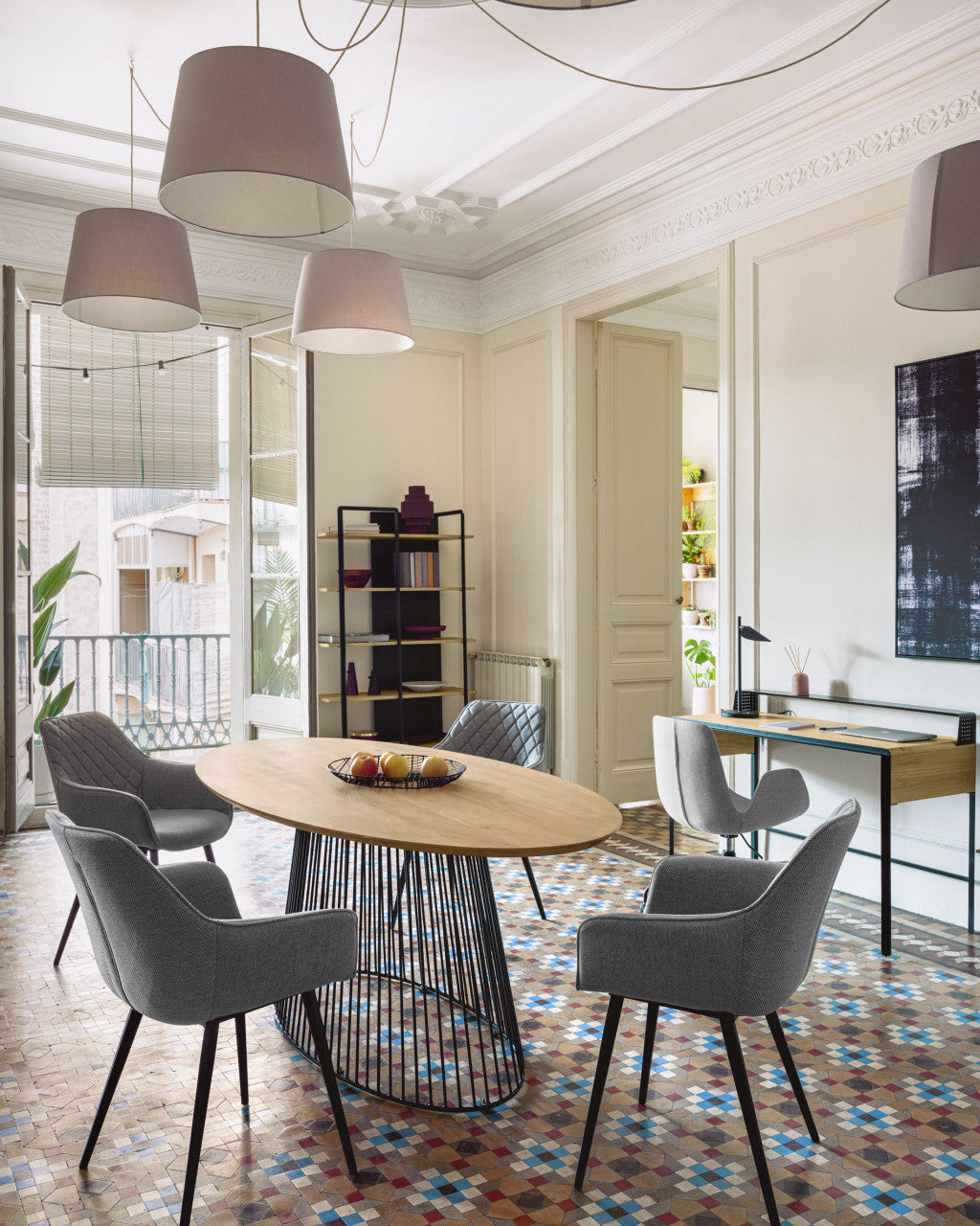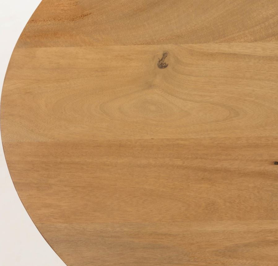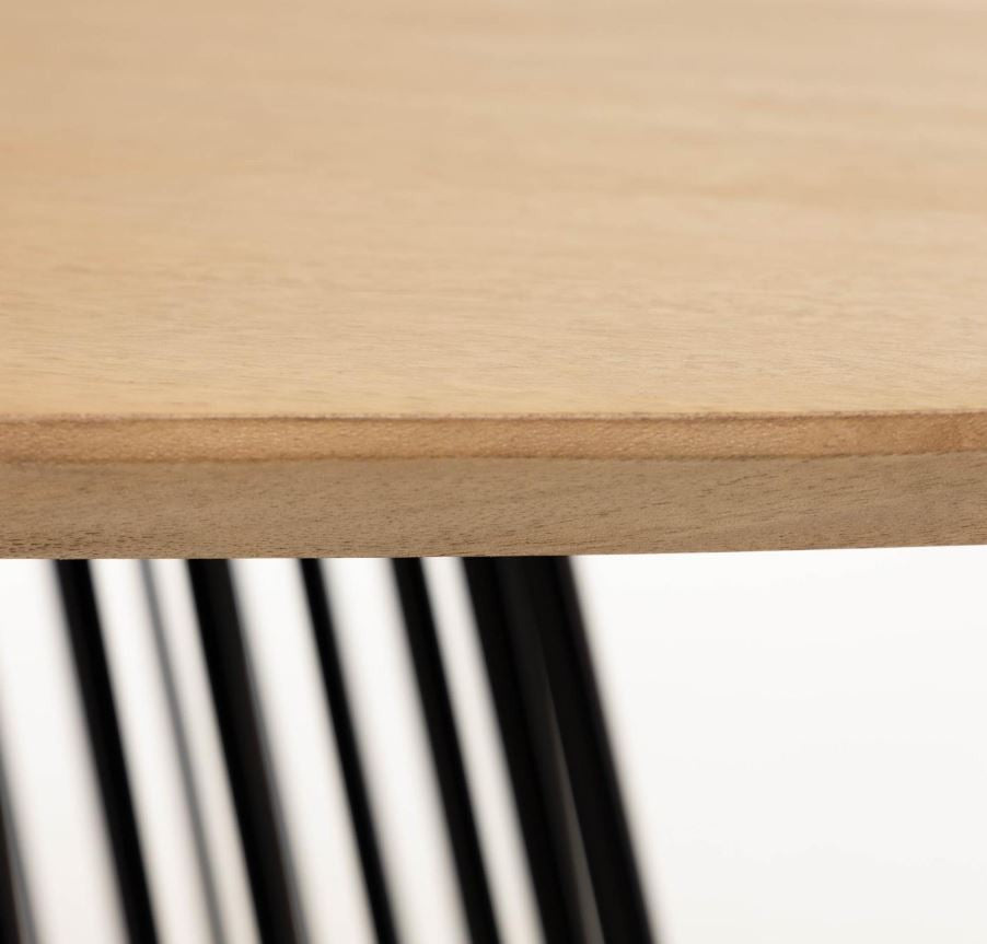 Masa Leska de 110x200 cm, de forma ovala, are blat din lemn masiv de mango cu structura din tija metalica, sudata una cate una si vopsita cu finisaj negru mat. Forma bazei mentine si senzatia de luminozitate si spatialitate datorita spatiilor dintre tije.