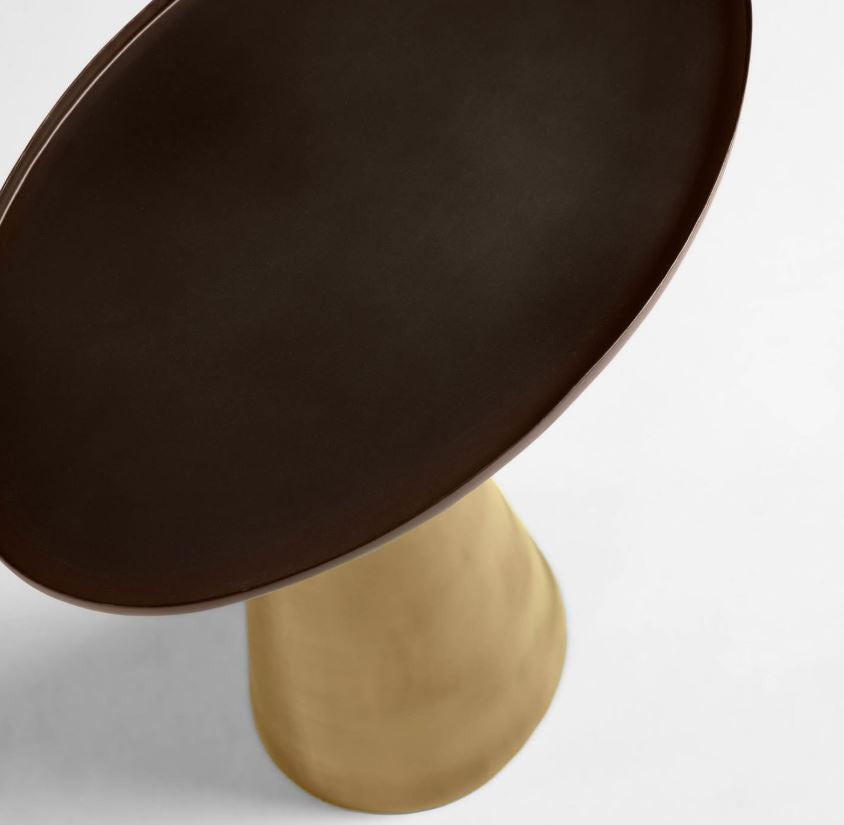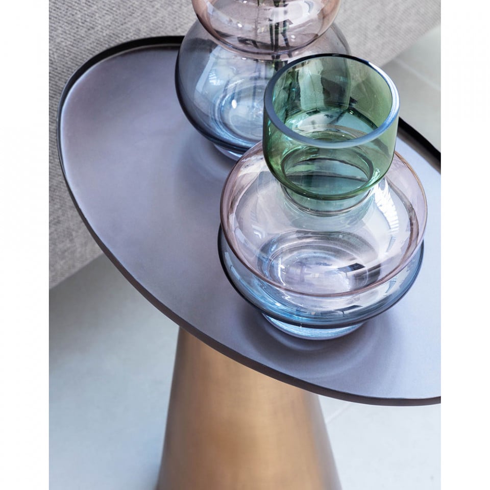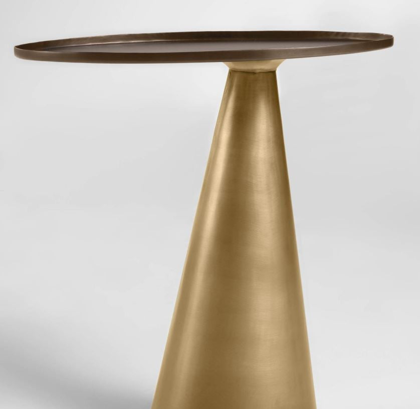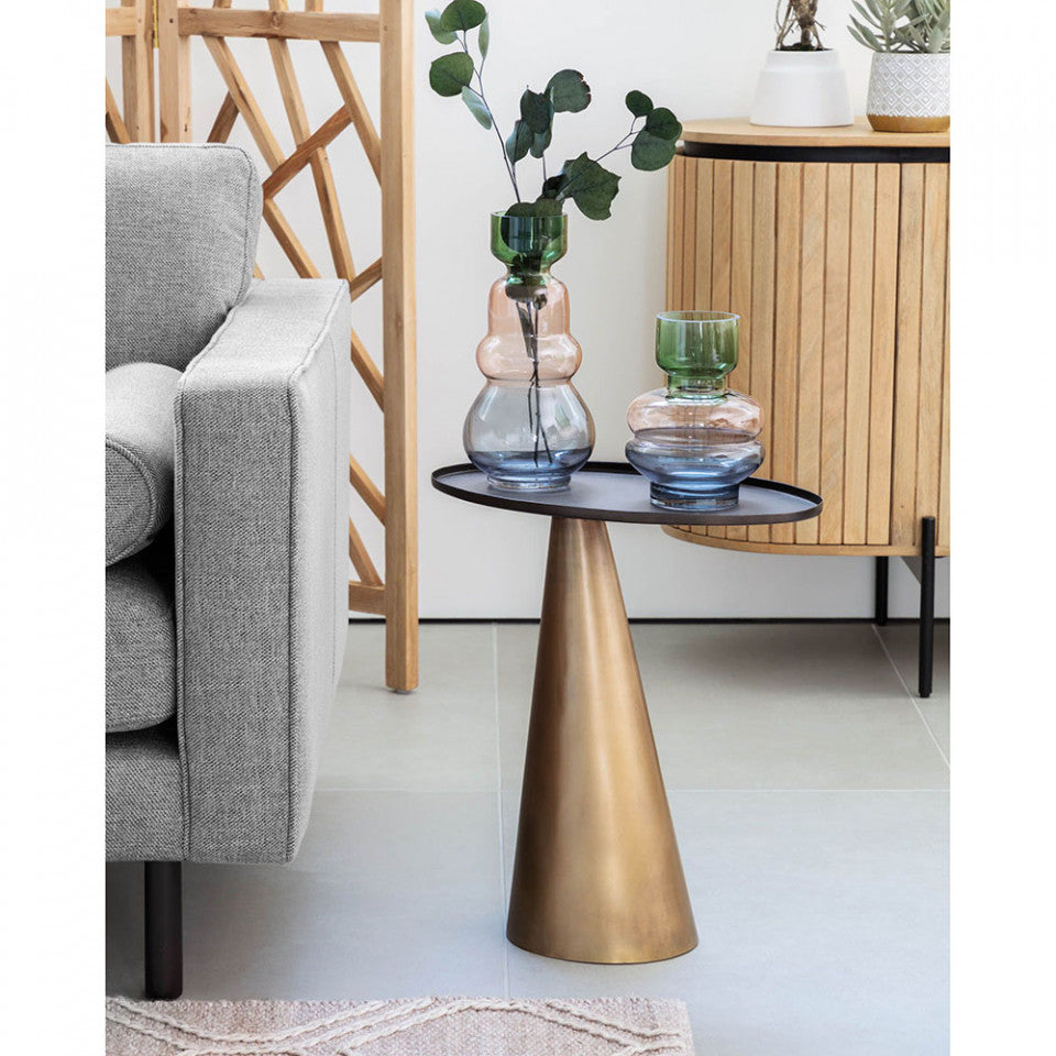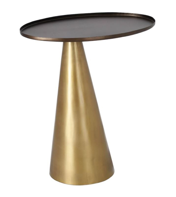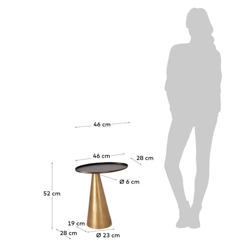 Masa laterala metalica Liliane are forme geometrice originale, cu baza conica si blatul oval. Finisajele sunt, de asemenea, la fel de uimitoare ca si designul sau, combinand auriul cu un finisaj invechit pentru baza si bronzul pentru blatul mesei. O piesa ideala pe care o poti aseza pe hol, langa canapea si chiar langa pat pe post de noptiera. Este prevazuta cu protectie din cauciuc pentru a proteja podeaua.