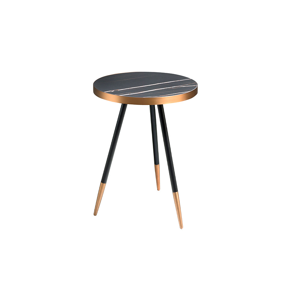 Masa laterala rotunda din portelan cu finisaj de marmura neagra este o piesa de mobilier moderna si eleganta, perfecta pentru a adauga un plus de stil si confort in orice camera de zi sau colt de lectura. Realizata din cele mai bune materiale, aceasta masa de colt este durabila si functionala, iar designul sau versatil ii permite sa se potriveasca in orice spatiu. Finisajul din otel placat cu aur in ton de cupru si marmura neagra adauga eleganta si distinctie, transformand aceasta masa de colt intr-o piesa de mobilier unica si deosebita.