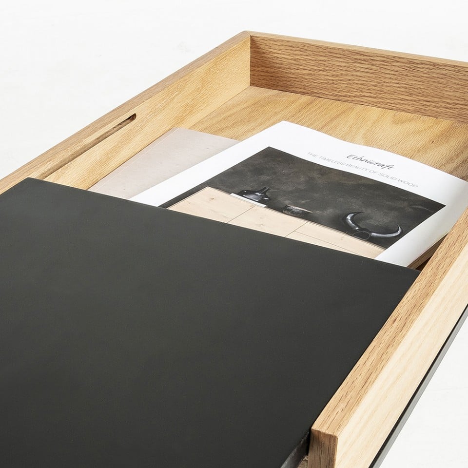 Designul original si minimalist fac din aceasta masa cu blatul din furnir de stejar una practica si estetica. In plus are si un compartiment aflat sub blatul glisant si picioare metalice.